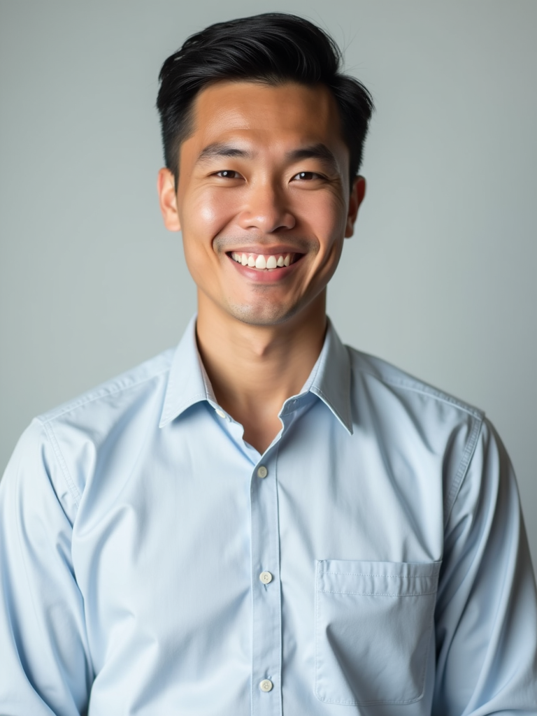 A professional doctor headshot of a confident model, taken in a well-lit studio with a plain backdrop. The model is dressed in a neat, light-colored shirt with a professional expression. The lighting is soft and even, highlighting their facial features with a warm and authoritative expression. The focus is sharp, capturing the model's eyes and reassuring smile, creating a perfect headshot for medical practices and professional profiles.