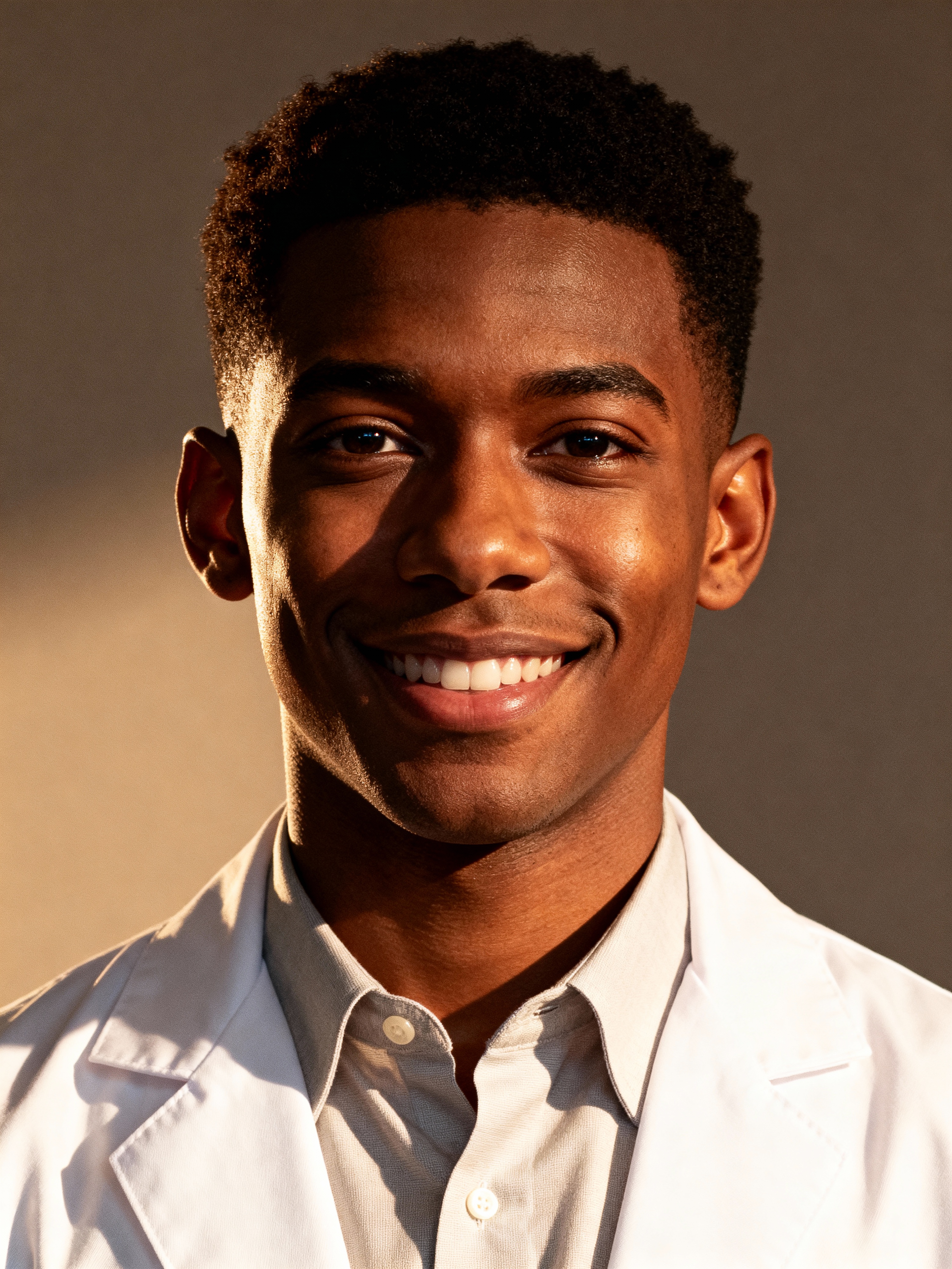 A professional doctor headshot of a confident model, taken in a well-lit studio with a plain backdrop. The model is dressed in a neat, white lab coat over a light-colored shirt with a professional expression. The lighting is soft and even, highlighting their facial features with a warm and authoritative expression. The focus is sharp, capturing the model's eyes and reassuring smile, creating a perfect headshot for medical practices and professional profiles.