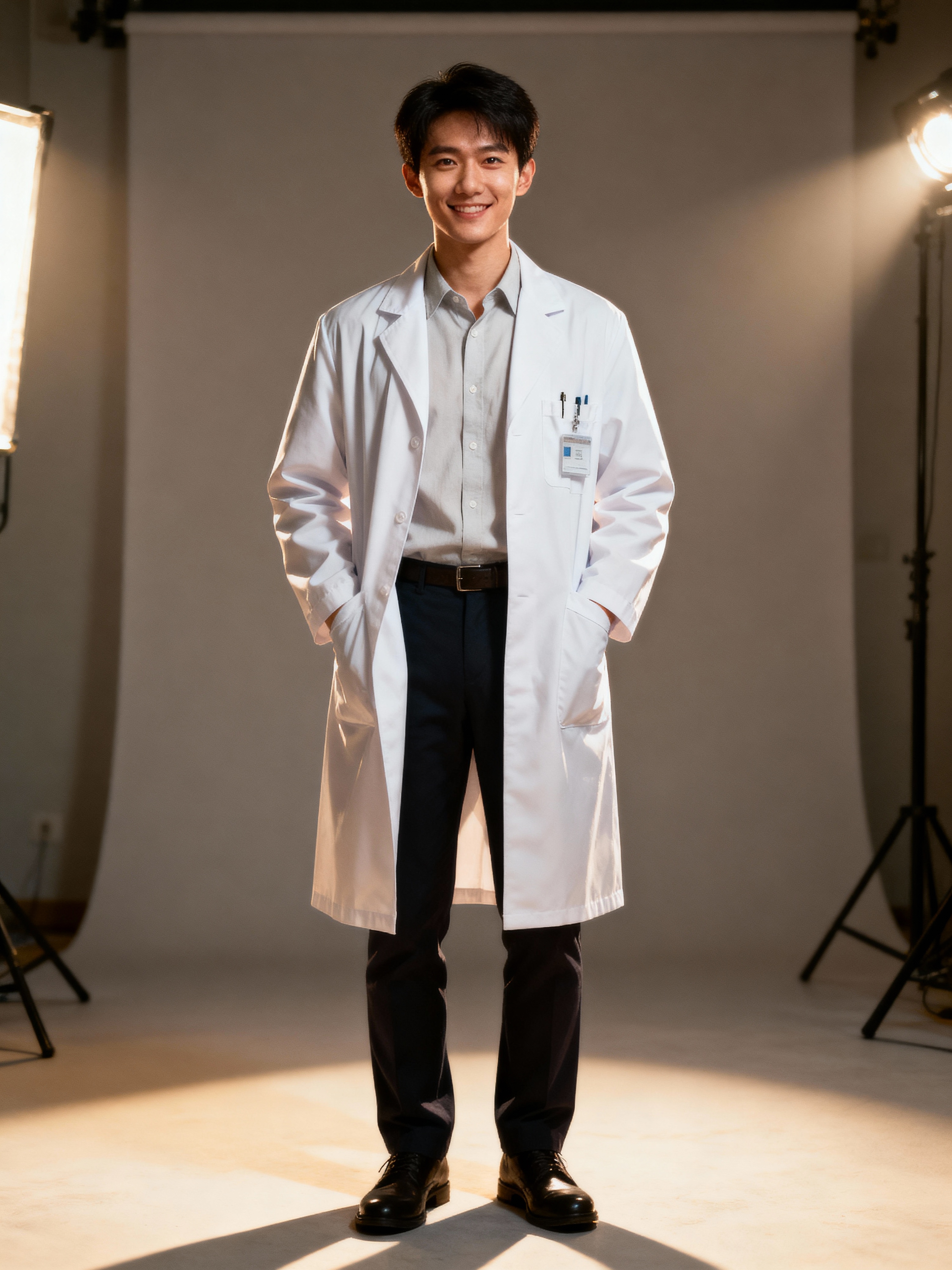 A professional doctor headshot of a confident model, taken in a well-lit studio with a plain backdrop. The model is dressed in a neat, white lab coat over a light-colored shirt with a professional expression. The lighting is soft and even, highlighting their facial features with a warm and authoritative expression. The focus is sharp, capturing the model's eyes and reassuring smile, creating a perfect headshot for medical practices and professional profiles.