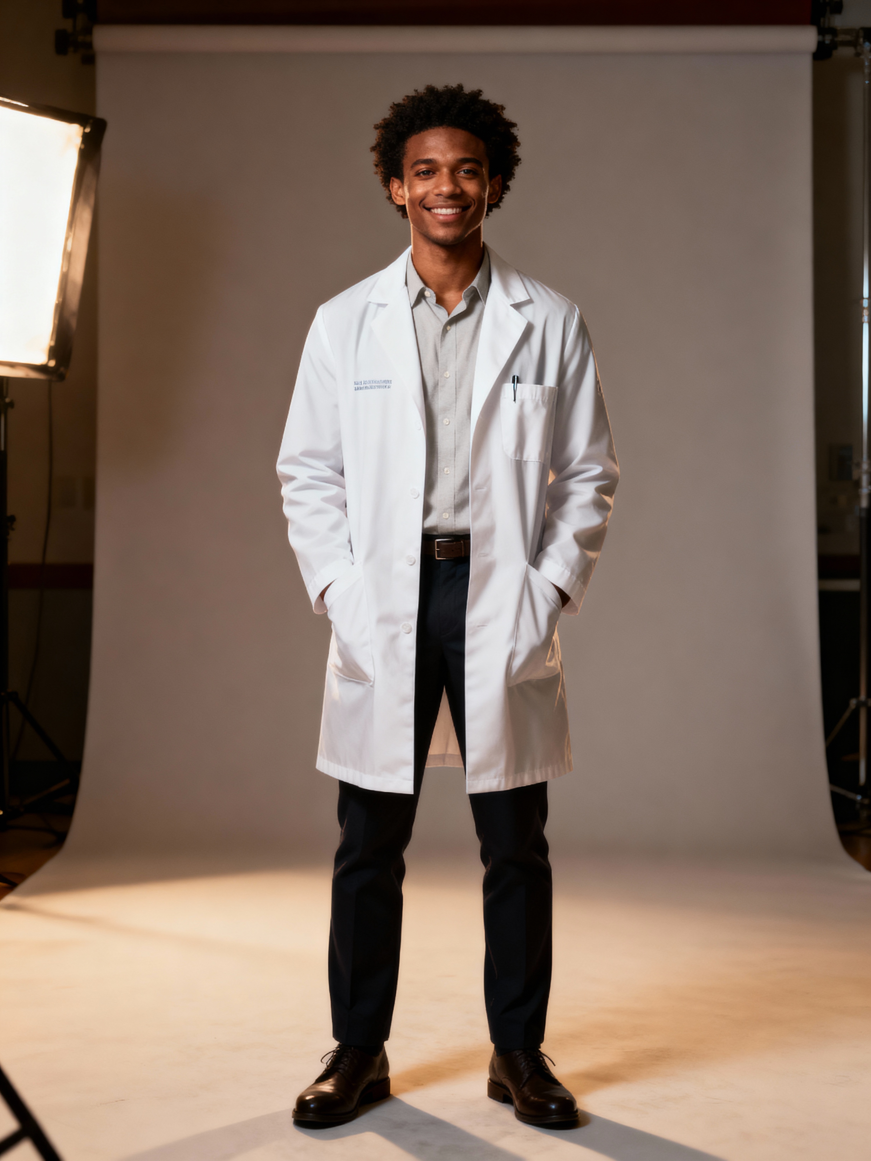 A professional doctor headshot of a confident model, taken in a well-lit studio with a plain backdrop. The model is dressed in a neat, white lab coat over a light-colored shirt with a professional expression. The lighting is soft and even, highlighting their facial features with a warm and authoritative expression. The focus is sharp, capturing the model's eyes and reassuring smile, creating a perfect headshot for medical practices and professional profiles.
