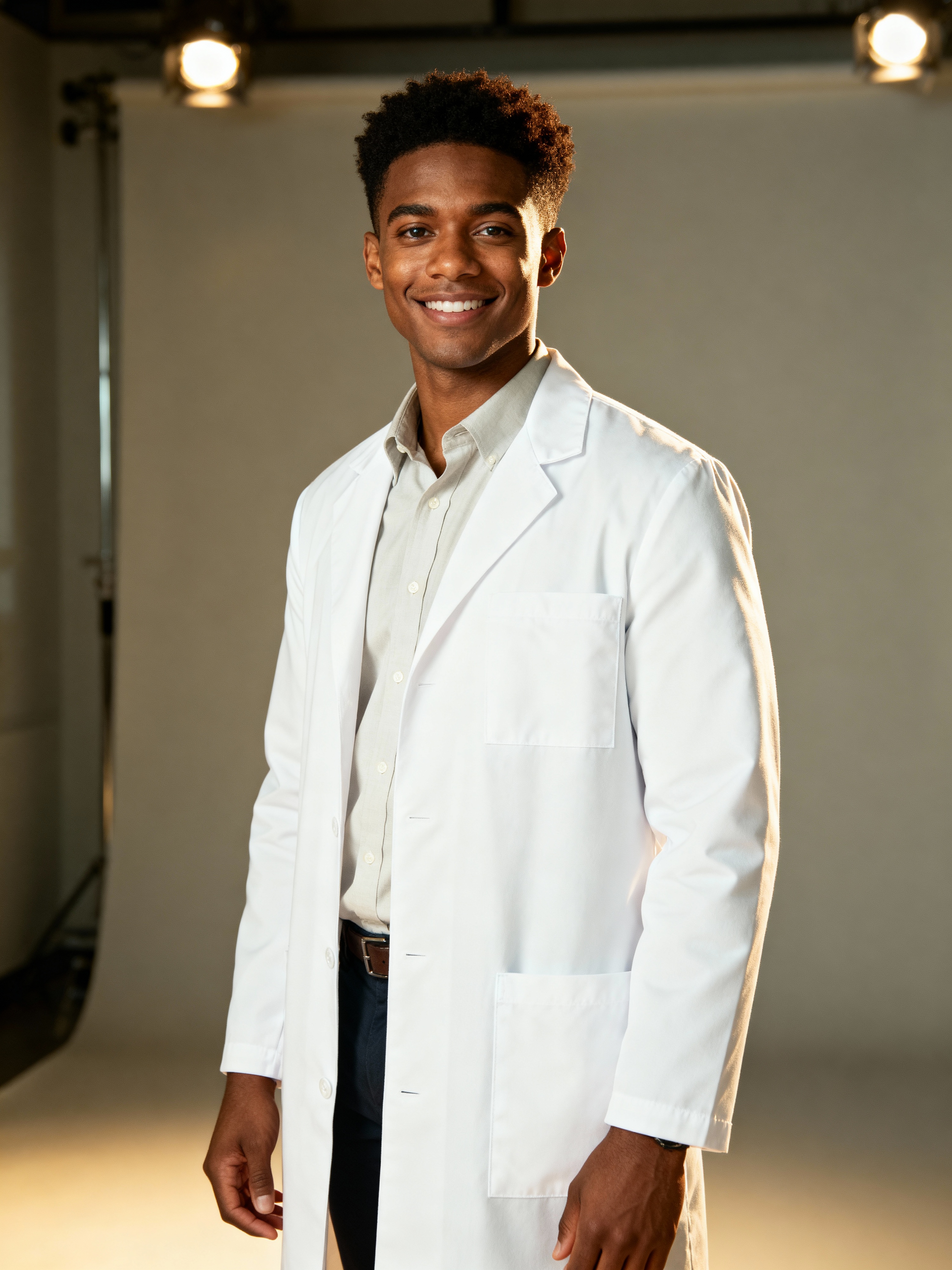 A professional doctor headshot of a confident model, taken in a well-lit studio with a plain backdrop. The model is dressed in a neat, white lab coat over a light-colored shirt with a professional expression. The lighting is soft and even, highlighting their facial features with a warm and authoritative expression. The focus is sharp, capturing the model's eyes and reassuring smile, creating a perfect headshot for medical practices and professional profiles.