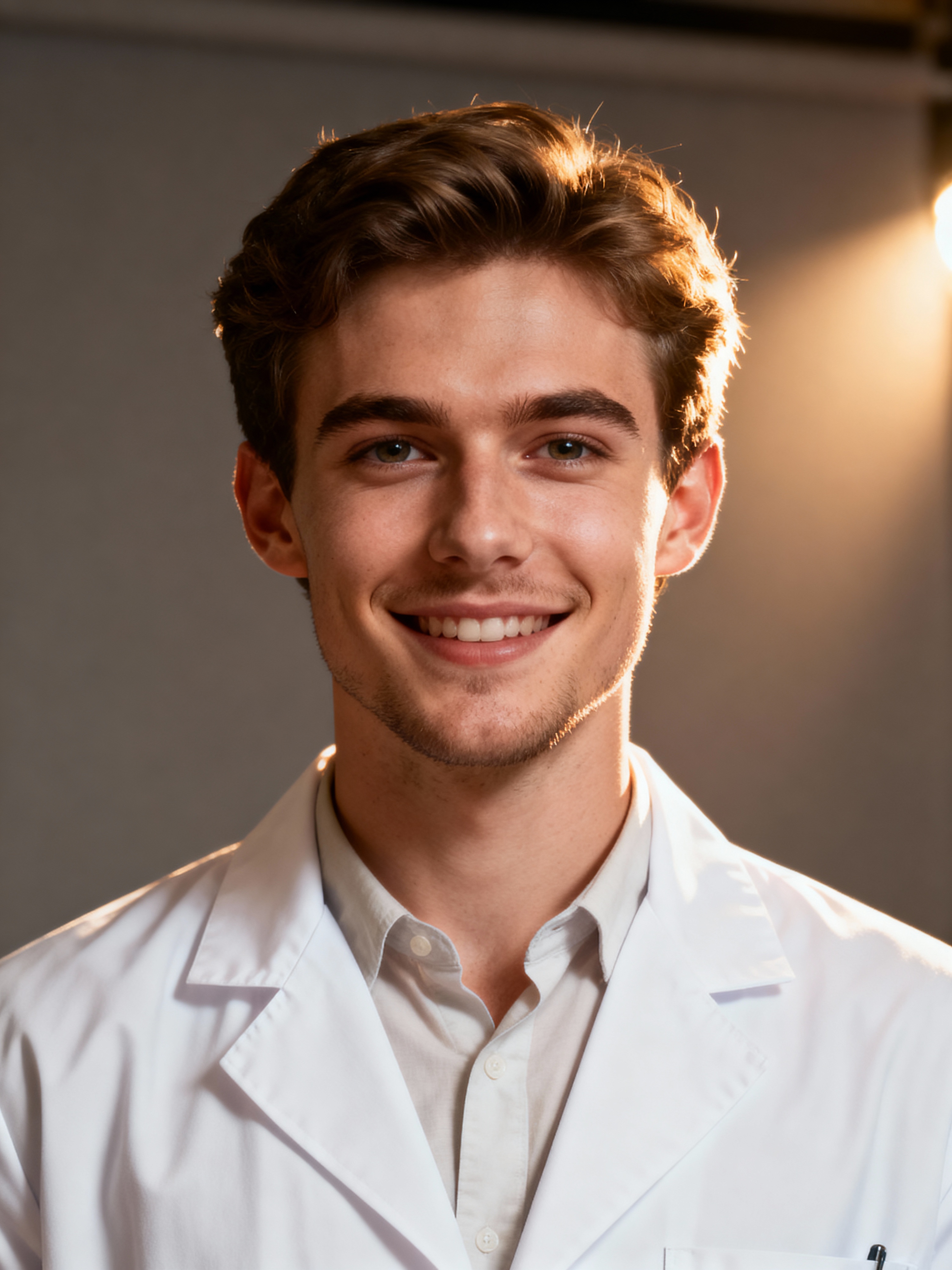 A professional doctor headshot of a confident model, taken in a well-lit studio with a plain backdrop. The model is dressed in a neat, white lab coat over a light-colored shirt with a professional expression. The lighting is soft and even, highlighting their facial features with a warm and authoritative expression. The focus is sharp, capturing the model's eyes and reassuring smile, creating a perfect headshot for medical practices and professional profiles.
