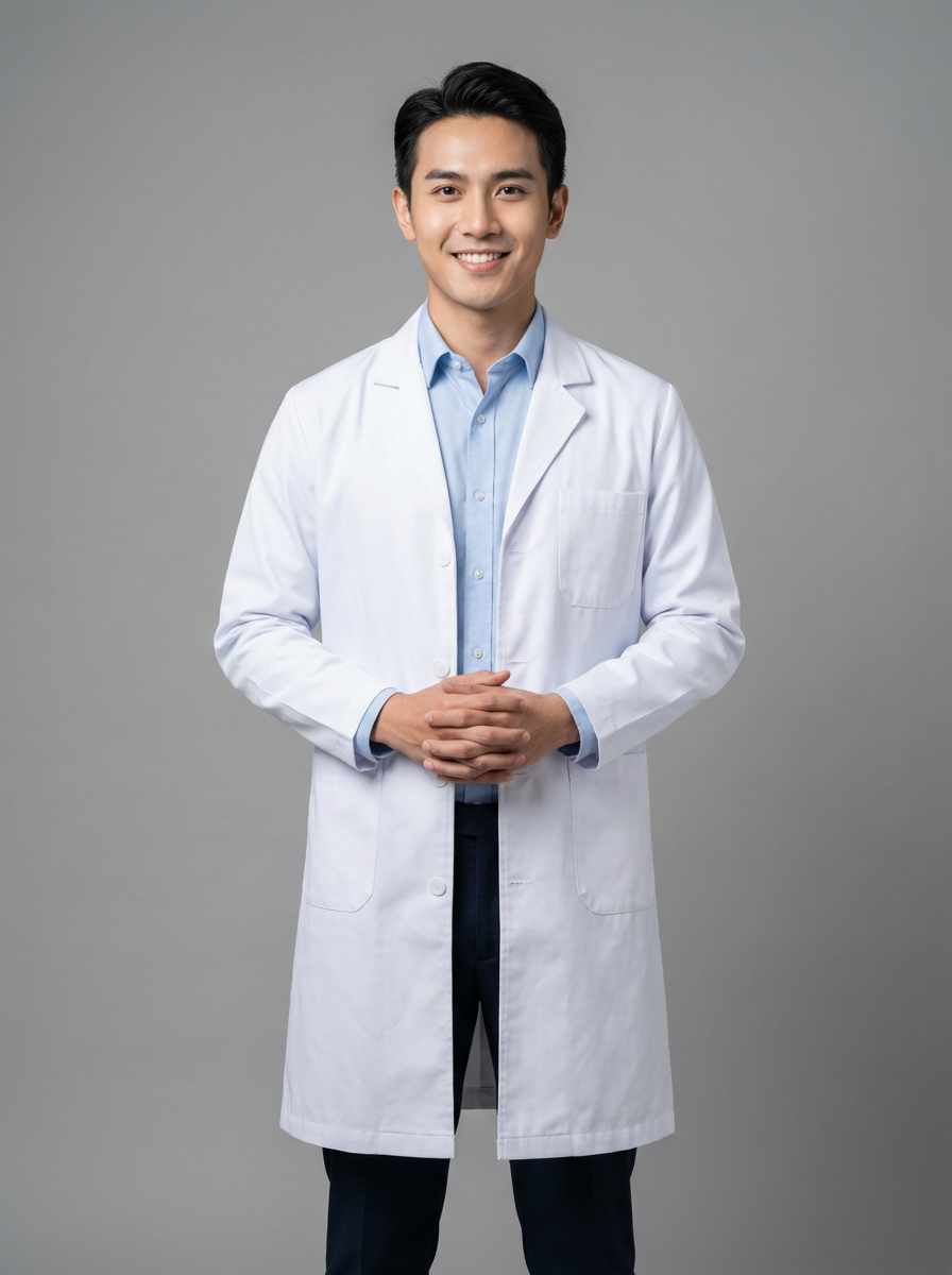 A professional doctor headshot of a confident model, taken in a well-lit studio with a plain backdrop. The model is dressed in a neat, white lab coat over a light-colored shirt with a professional expression. The lighting is soft and even, highlighting their facial features with a warm and authoritative expression. The focus is sharp, capturing the model's eyes and reassuring smile, creating a perfect headshot for medical practices and professional profiles.