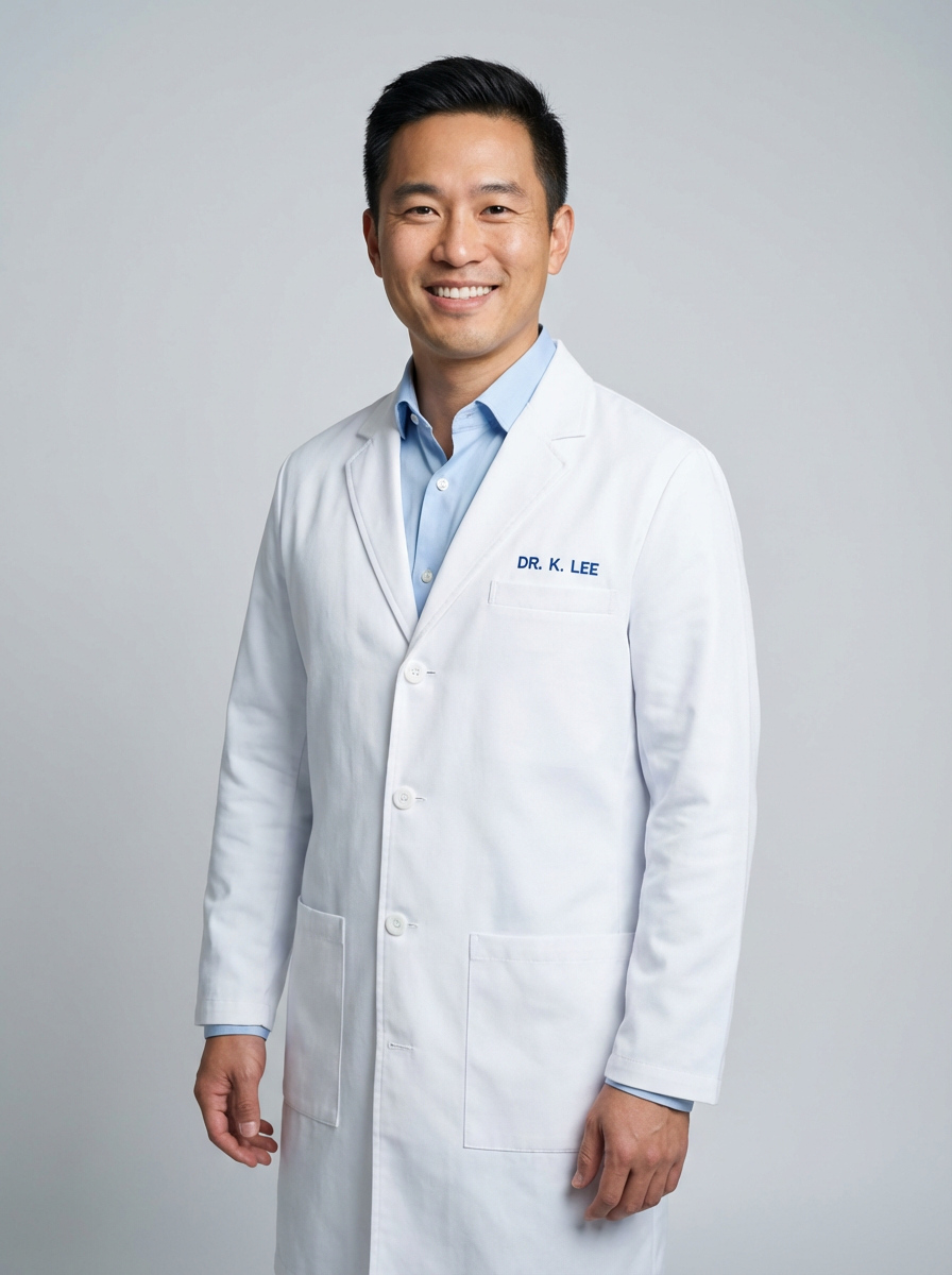 A professional doctor headshot of a confident model, taken in a well-lit studio with a plain backdrop. The model is dressed in a neat, white lab coat over a light-colored shirt with a professional expression. The lighting is soft and even, highlighting their facial features with a warm and authoritative expression. The focus is sharp, capturing the model's eyes and reassuring smile, creating a perfect headshot for medical practices and professional profiles.