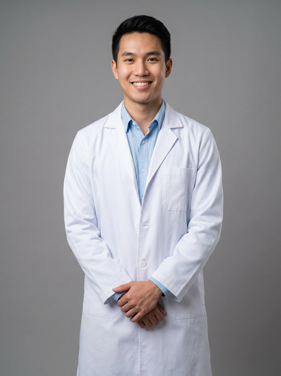 A professional doctor headshot of a confident model, taken in a well-lit studio with a plain backdrop. The model is dressed in a neat, white lab coat over a light-colored shirt with a professional expression. The lighting is soft and even, highlighting their facial features with a warm and authoritative expression. The focus is sharp, capturing the model's eyes and reassuring smile, creating a perfect headshot for medical practices and professional profiles.