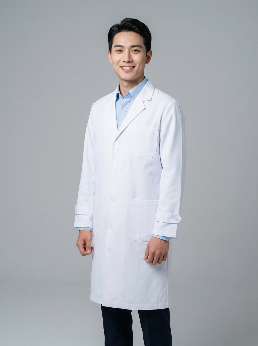 A professional doctor headshot of a confident model, taken in a well-lit studio with a plain backdrop. The model is dressed in a neat, white lab coat over a light-colored shirt with a professional expression. The lighting is soft and even, highlighting their facial features with a warm and authoritative expression. The focus is sharp, capturing the model's eyes and reassuring smile, creating a perfect headshot for medical practices and professional profiles.