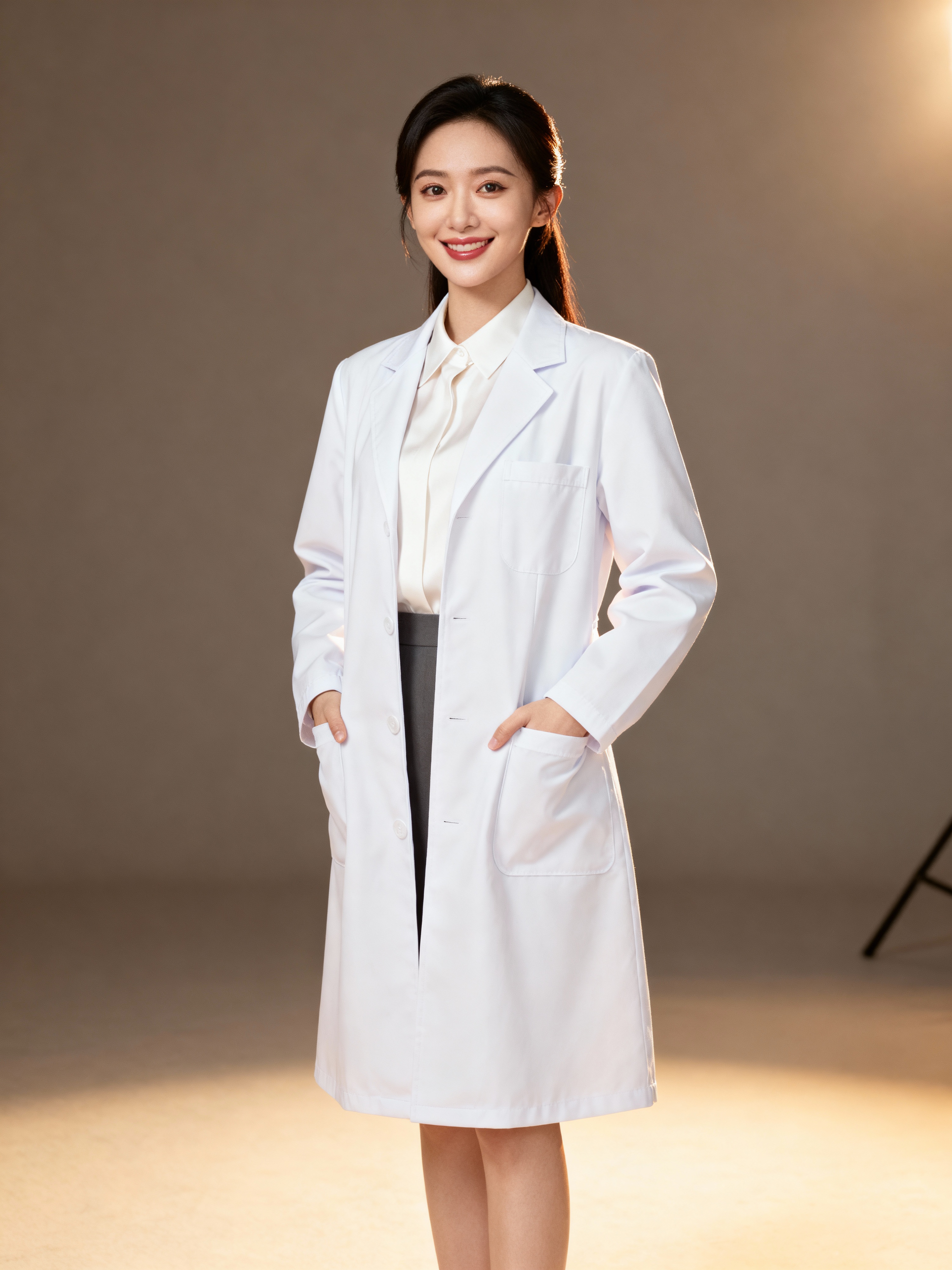 A professional doctor headshot of a confident model, taken in a well-lit studio with a plain backdrop. The model is dressed in a crisp, white lab coat over a professional blouse with natural makeup and a confident smile . The lighting is soft and even, highlighting their facial features with a warm and authoritative expression. The focus is sharp, capturing the model's eyes and reassuring smile, creating a perfect headshot for medical practices and professional profiles.