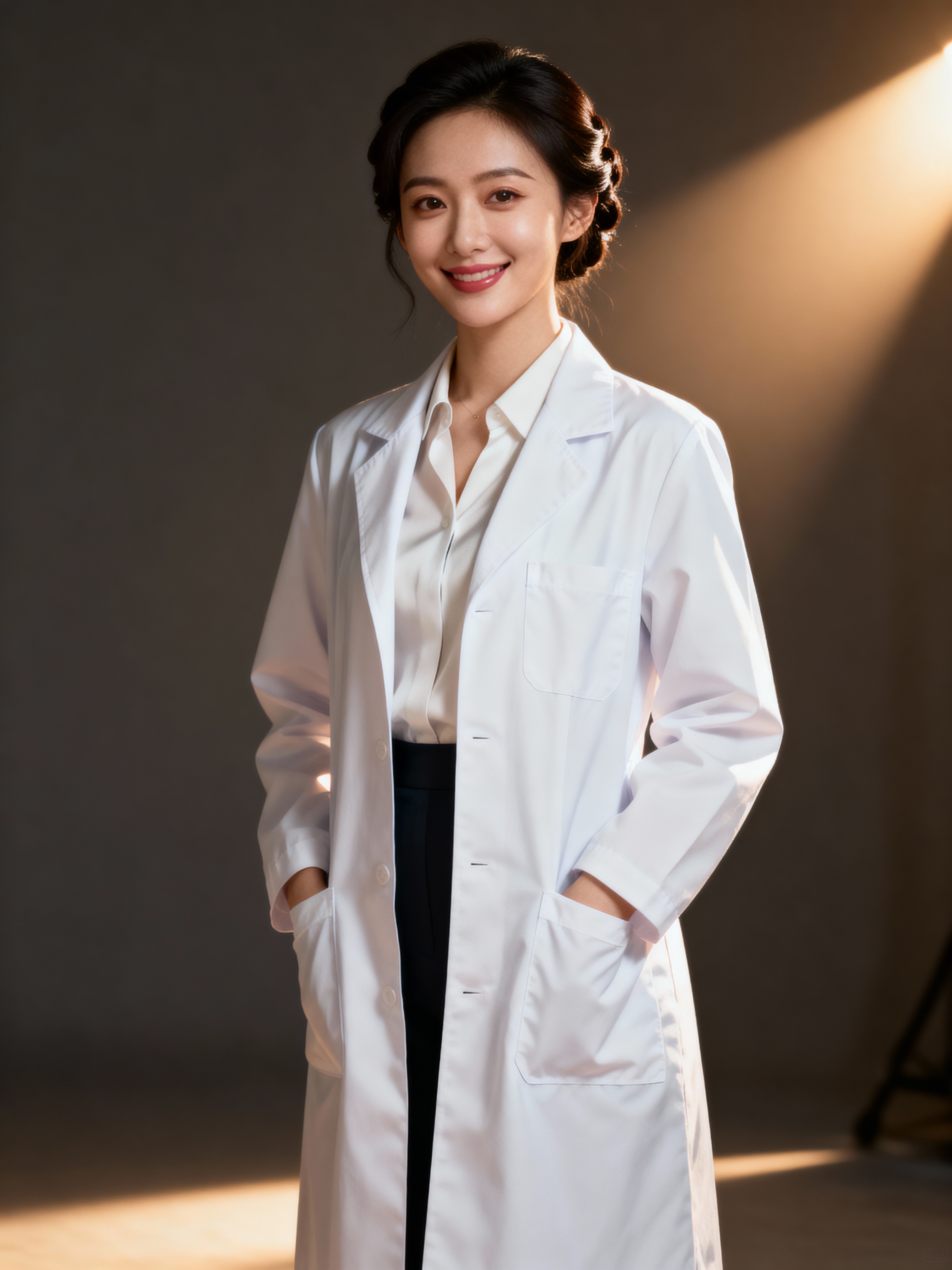 A professional doctor headshot of a confident model, taken in a well-lit studio with a plain backdrop. The model is dressed in a crisp, white lab coat over a professional blouse with natural makeup and a confident smile . The lighting is soft and even, highlighting their facial features with a warm and authoritative expression. The focus is sharp, capturing the model's eyes and reassuring smile, creating a perfect headshot for medical practices and professional profiles.