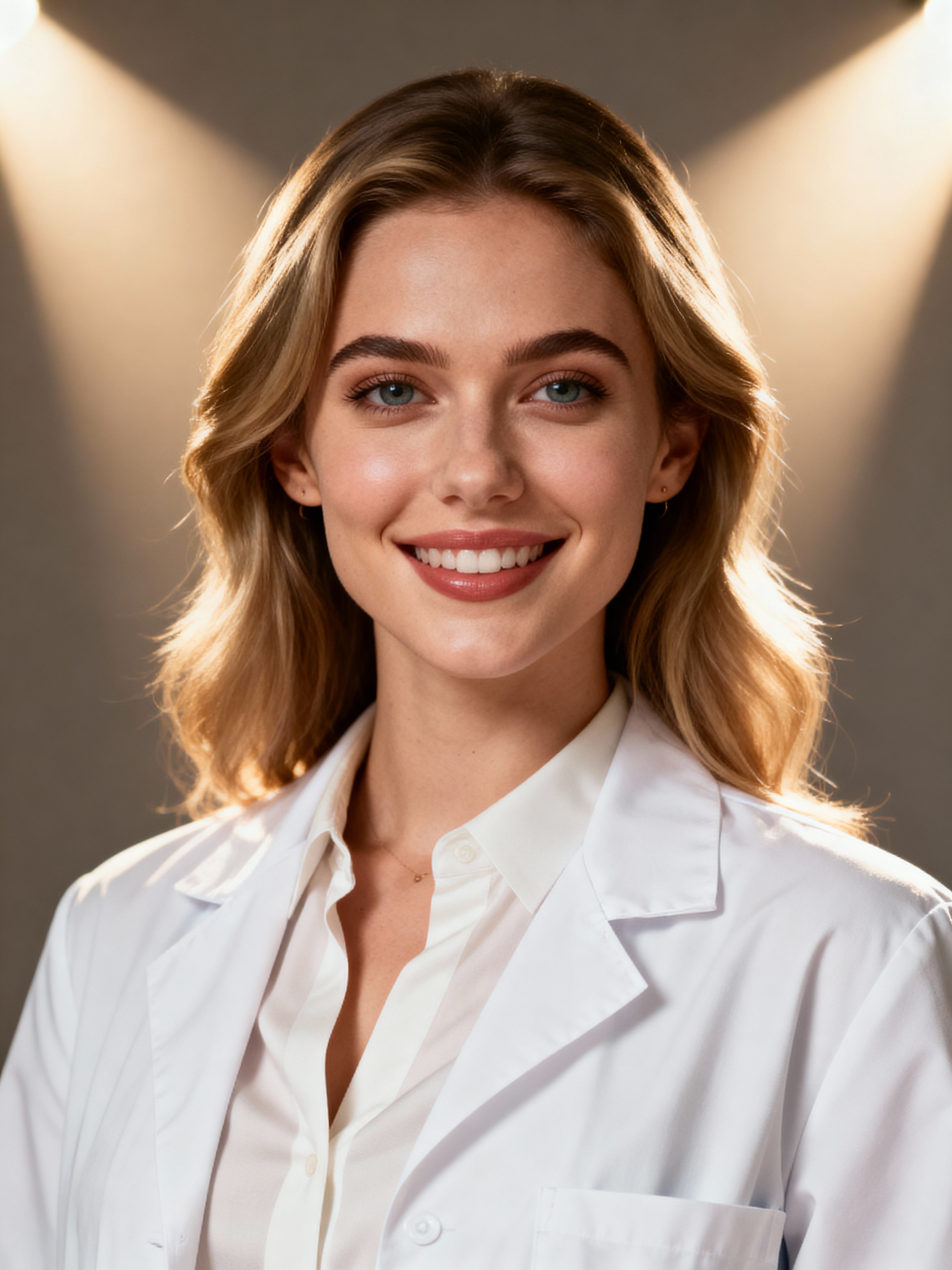 A professional doctor headshot of a confident model, taken in a well-lit studio with a plain backdrop. The model is dressed in a crisp, white lab coat over a professional blouse with natural makeup and a confident smile . The lighting is soft and even, highlighting their facial features with a warm and authoritative expression. The focus is sharp, capturing the model's eyes and reassuring smile, creating a perfect headshot for medical practices and professional profiles.