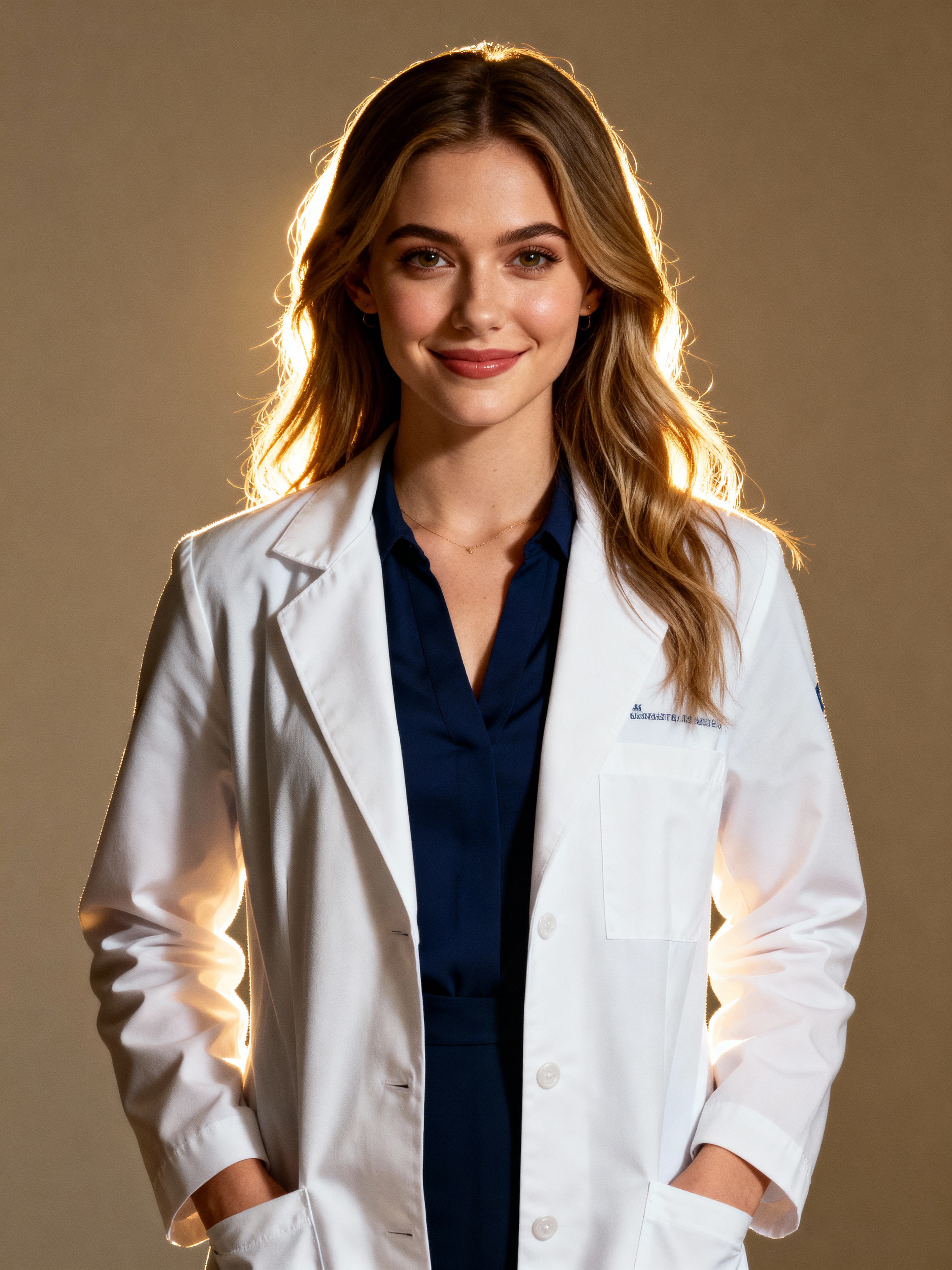 A professional doctor headshot of a confident model, taken in a well-lit studio with a plain backdrop. The model is dressed in a crisp, white lab coat over a professional blouse with natural makeup and a confident smile . The lighting is soft and even, highlighting their facial features with a warm and authoritative expression. The focus is sharp, capturing the model's eyes and reassuring smile, creating a perfect headshot for medical practices and professional profiles.
