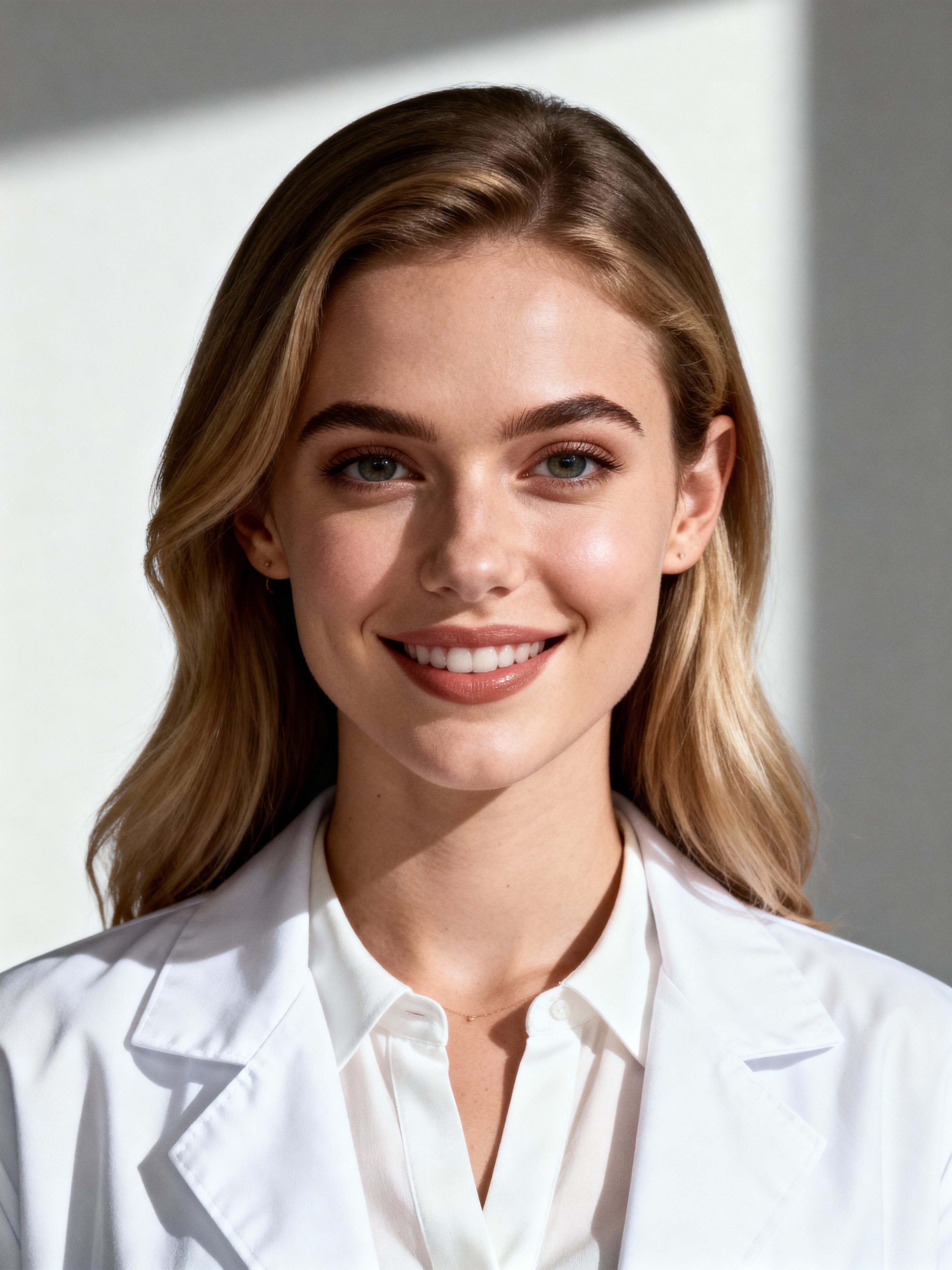 A professional doctor headshot of a confident model, taken in a well-lit studio with a plain backdrop. The model is dressed in a crisp, white lab coat over a professional blouse with natural makeup and a confident smile . The lighting is soft and even, highlighting their facial features with a warm and authoritative expression. The focus is sharp, capturing the model's eyes and reassuring smile, creating a perfect headshot for medical practices and professional profiles.