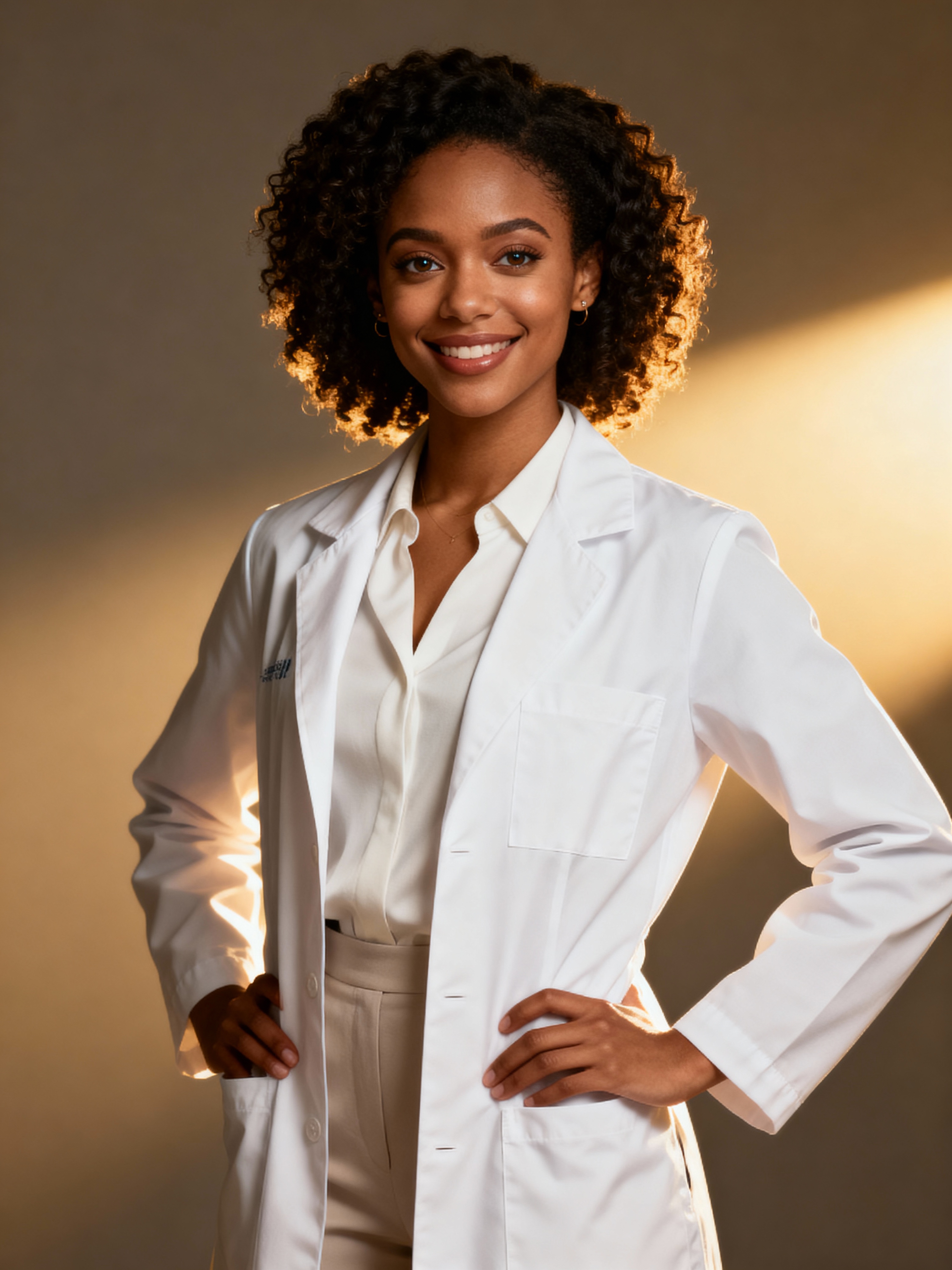 A professional doctor headshot of a confident model, taken in a well-lit studio with a plain backdrop. The model is dressed in a crisp, white lab coat over a professional blouse with natural makeup and a confident smile . The lighting is soft and even, highlighting their facial features with a warm and authoritative expression. The focus is sharp, capturing the model's eyes and reassuring smile, creating a perfect headshot for medical practices and professional profiles.