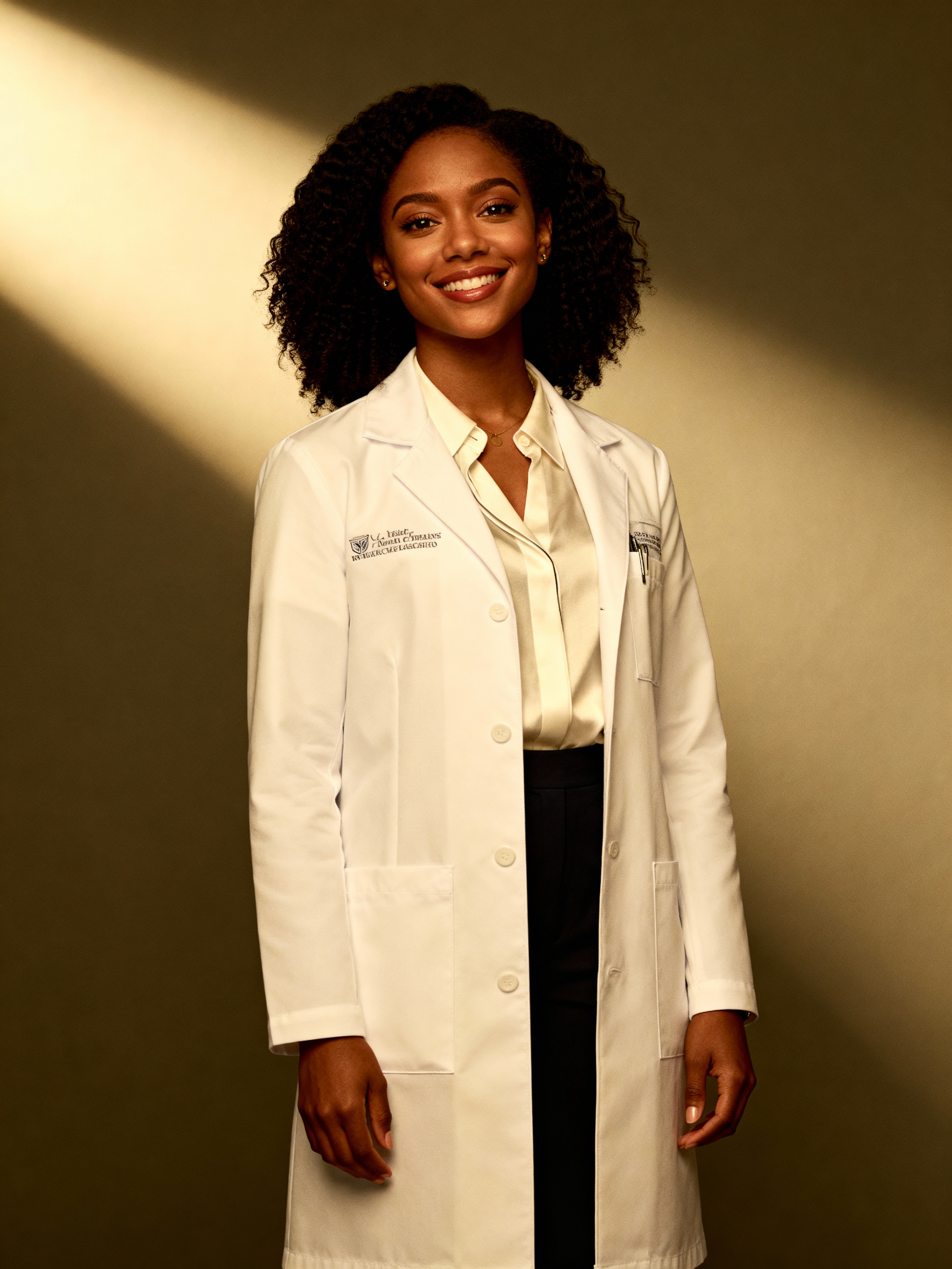 A professional doctor headshot of a confident model, taken in a well-lit studio with a plain backdrop. The model is dressed in a crisp, white lab coat over a professional blouse with natural makeup and a confident smile . The lighting is soft and even, highlighting their facial features with a warm and authoritative expression. The focus is sharp, capturing the model's eyes and reassuring smile, creating a perfect headshot for medical practices and professional profiles.