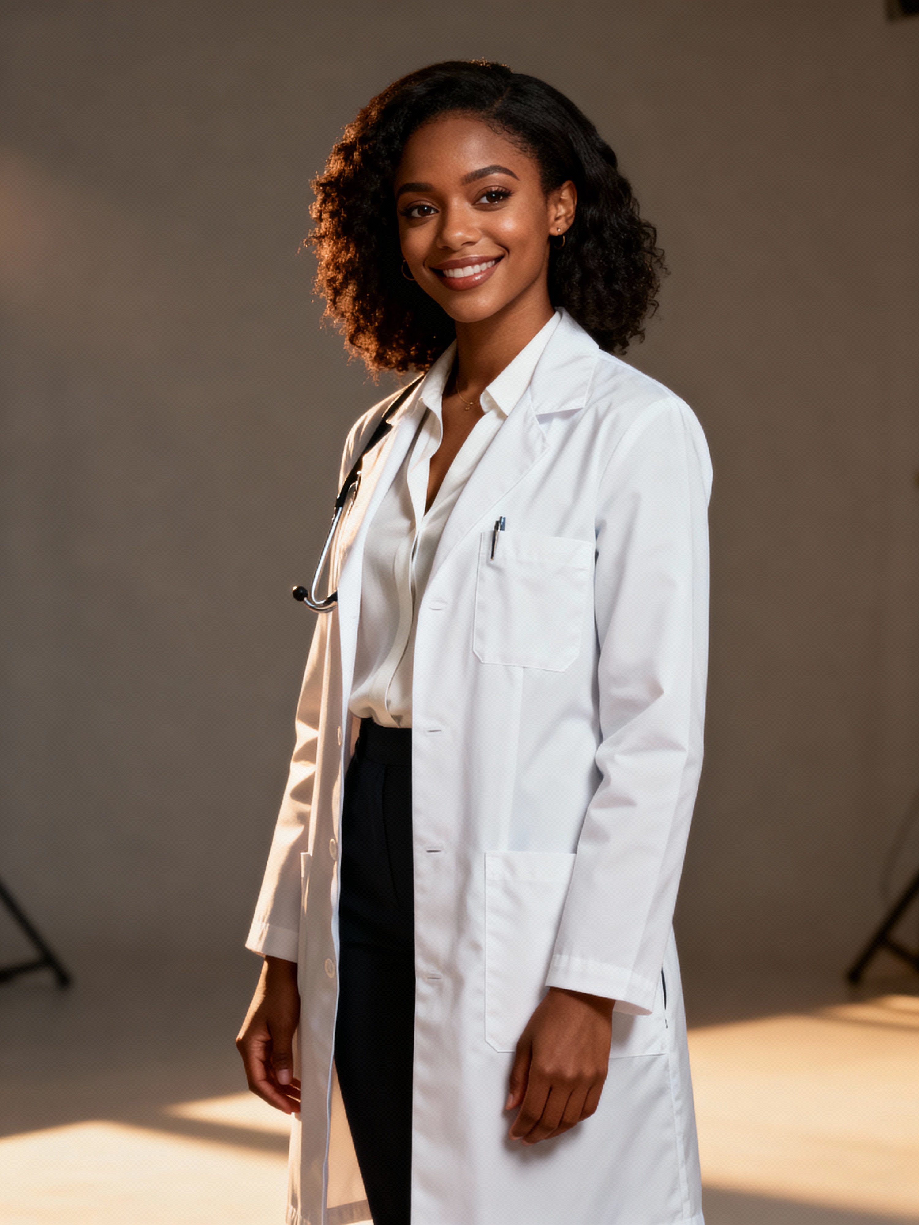 A professional doctor headshot of a confident model, taken in a well-lit studio with a plain backdrop. The model is dressed in a crisp, white lab coat over a professional blouse with natural makeup and a confident smile . The lighting is soft and even, highlighting their facial features with a warm and authoritative expression. The focus is sharp, capturing the model's eyes and reassuring smile, creating a perfect headshot for medical practices and professional profiles.