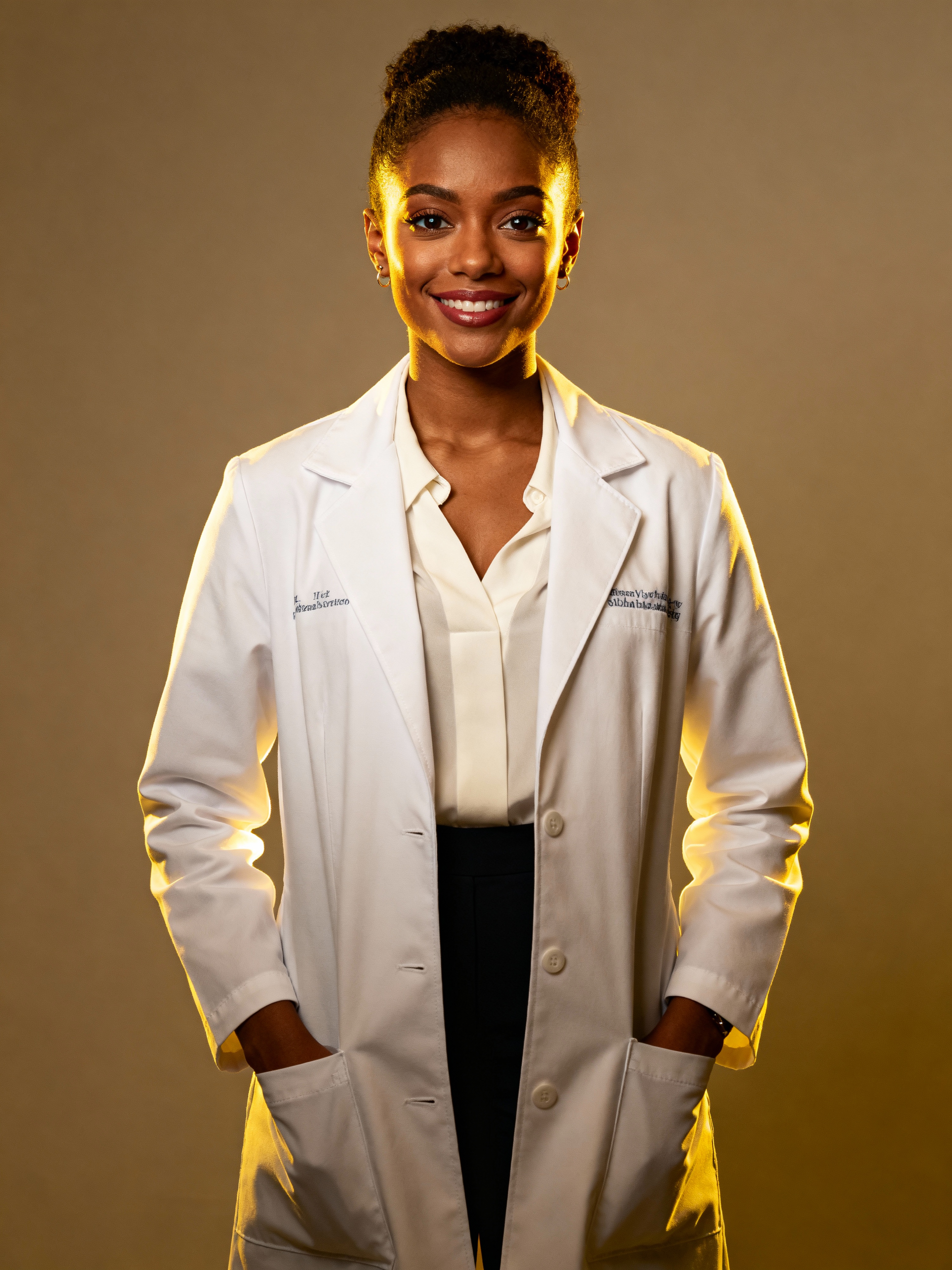A professional doctor headshot of a confident model, taken in a well-lit studio with a plain backdrop. The model is dressed in a crisp, white lab coat over a professional blouse with natural makeup and a confident smile . The lighting is soft and even, highlighting their facial features with a warm and authoritative expression. The focus is sharp, capturing the model's eyes and reassuring smile, creating a perfect headshot for medical practices and professional profiles.