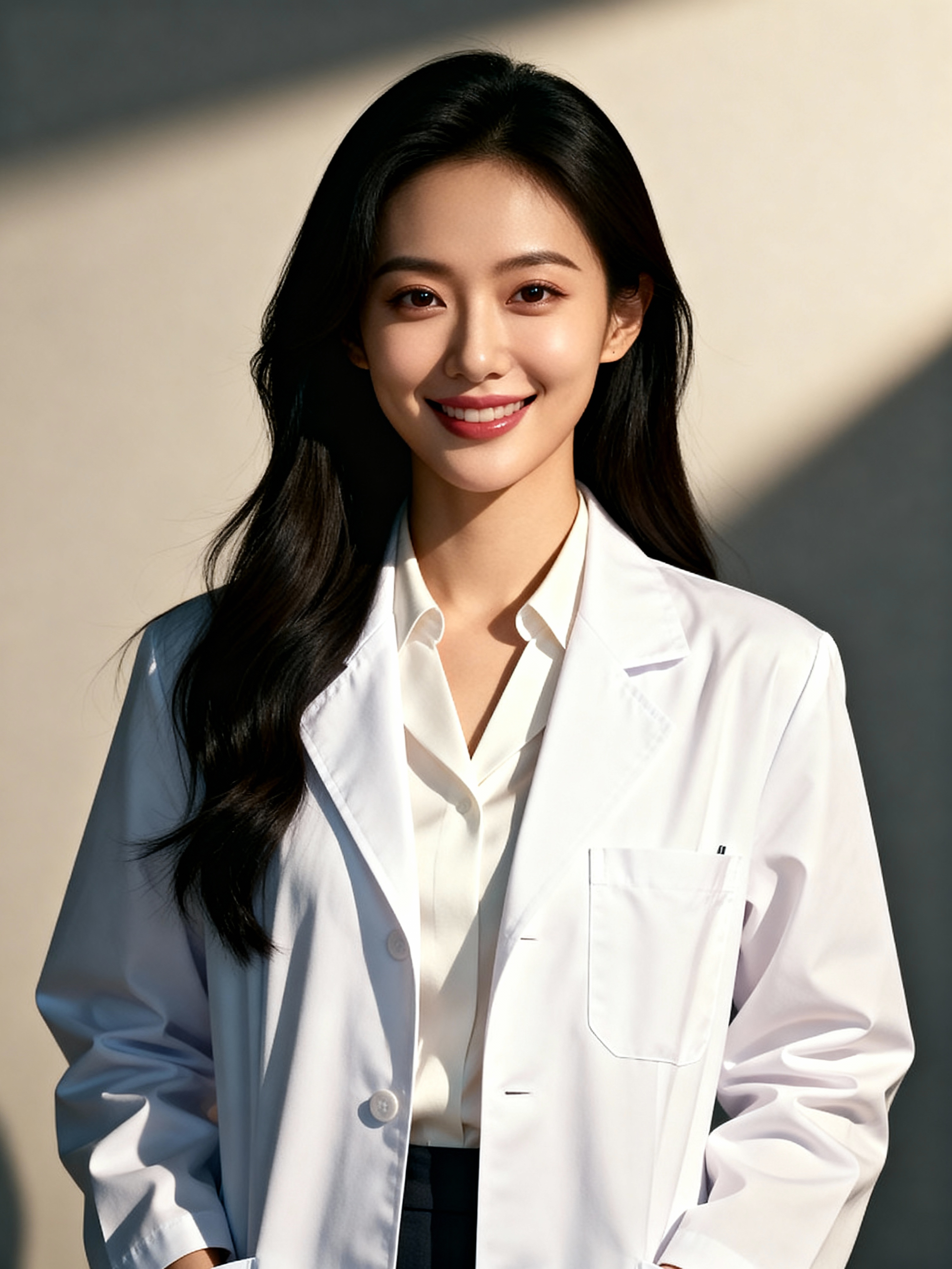 A professional doctor headshot of a confident model, taken in a well-lit studio with a plain backdrop. The model is dressed in a crisp, white lab coat over a professional blouse with natural makeup and a confident smile . The lighting is soft and even, highlighting their facial features with a warm and authoritative expression. The focus is sharp, capturing the model's eyes and reassuring smile, creating a perfect headshot for medical practices and professional profiles.