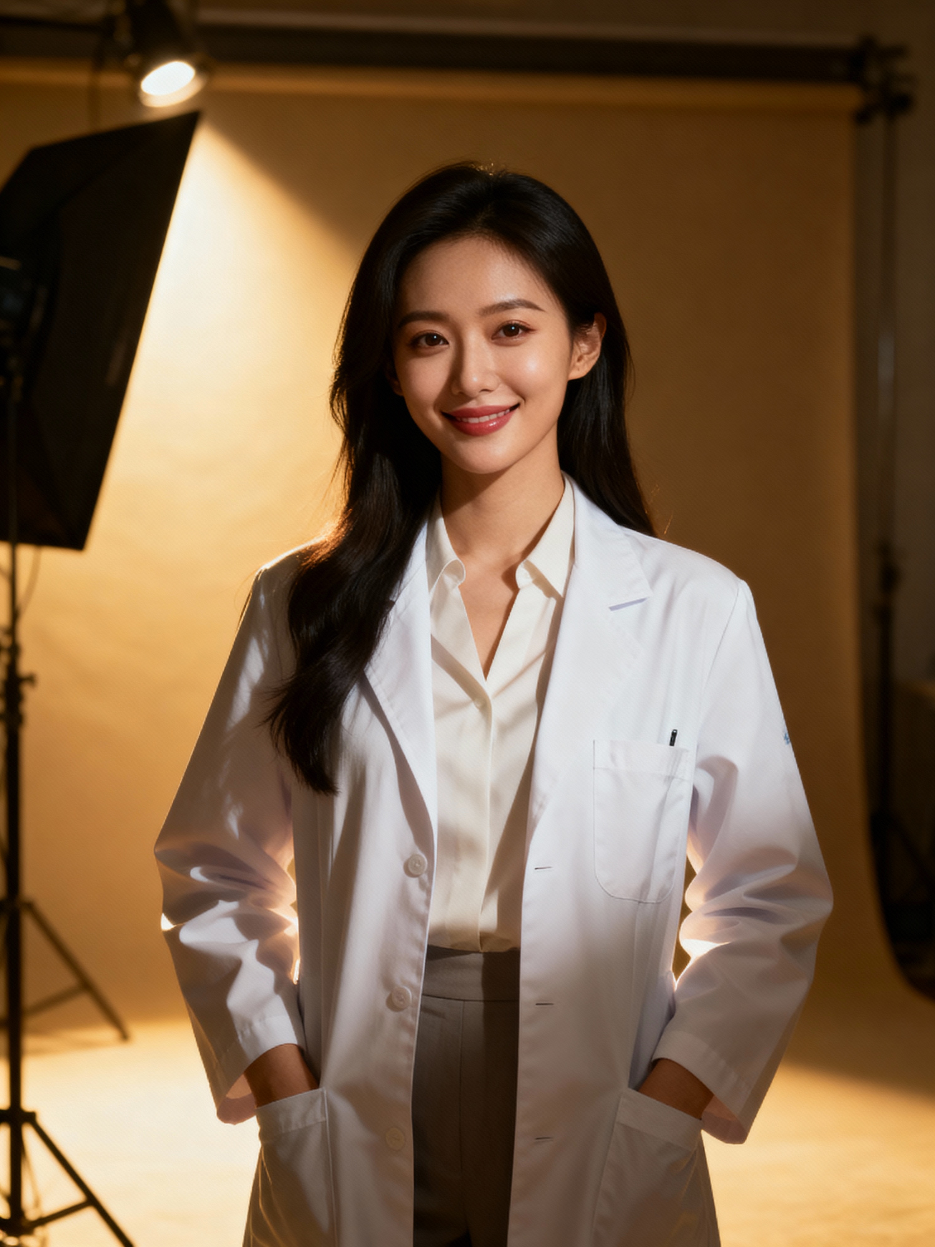 A professional doctor headshot of a confident model, taken in a well-lit studio with a plain backdrop. The model is dressed in a crisp, white lab coat over a professional blouse with natural makeup and a confident smile . The lighting is soft and even, highlighting their facial features with a warm and authoritative expression. The focus is sharp, capturing the model's eyes and reassuring smile, creating a perfect headshot for medical practices and professional profiles.