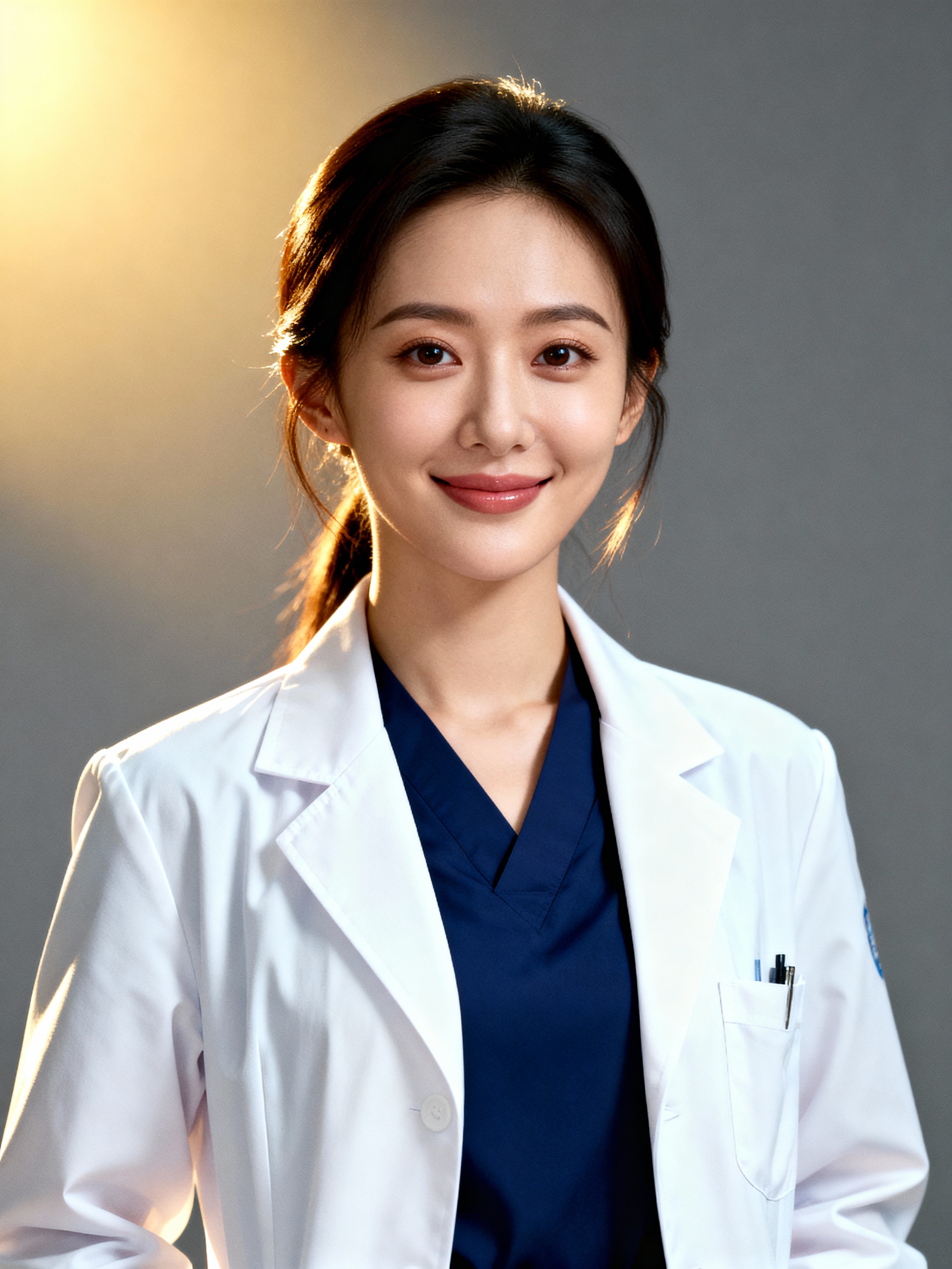 A professional doctor headshot of a confident model, taken in a well-lit studio with a plain backdrop. The model is dressed in a crisp, white lab coat over a professional blouse with natural makeup and a confident smile . The lighting is soft and even, highlighting their facial features with a warm and authoritative expression. The focus is sharp, capturing the model's eyes and reassuring smile, creating a perfect headshot for medical practices and professional profiles.