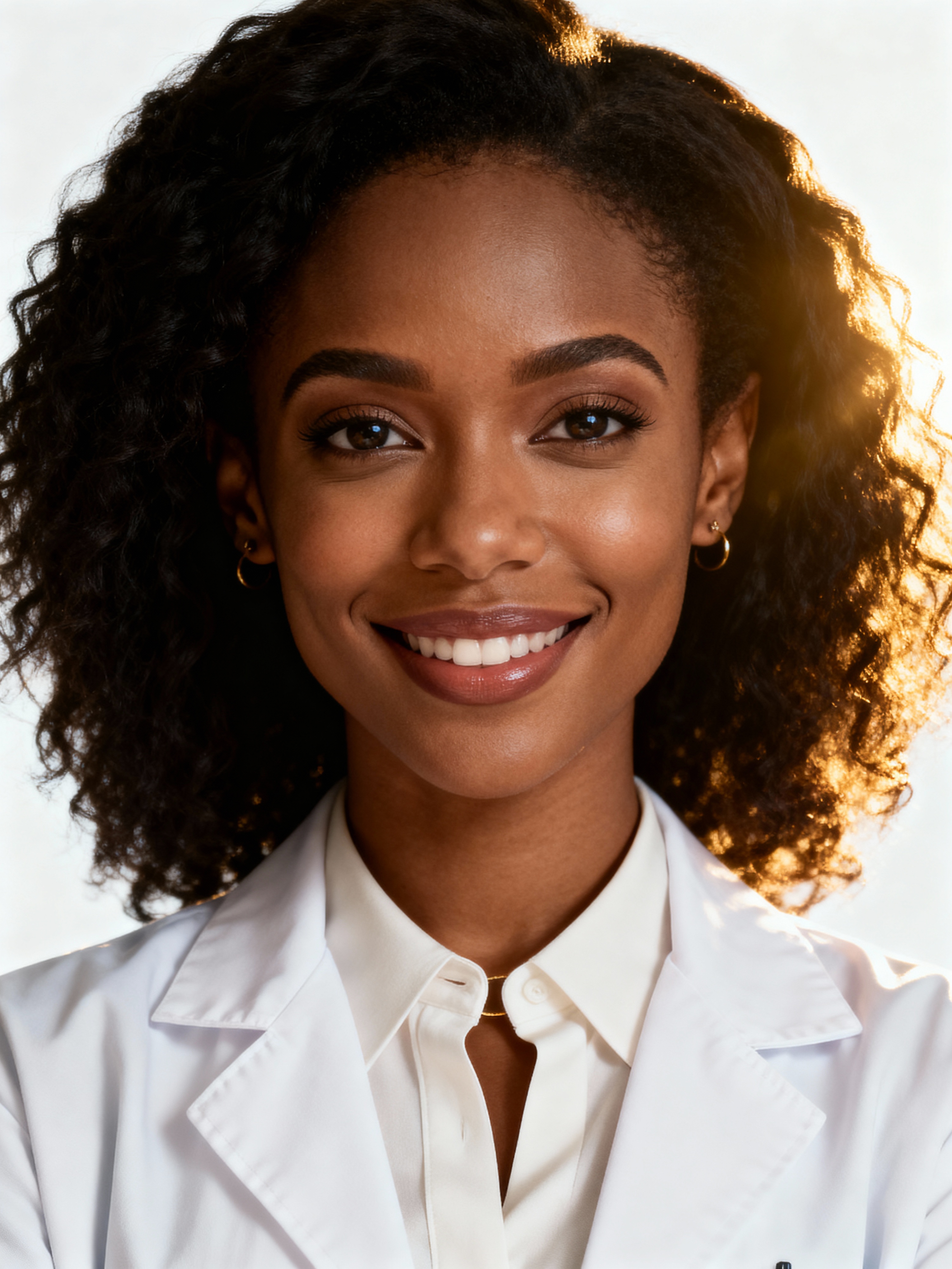 A professional doctor headshot of a confident model, taken in a well-lit studio with a plain backdrop. The model is dressed in a crisp, white lab coat over a professional blouse with natural makeup and a confident smile . The lighting is soft and even, highlighting their facial features with a warm and authoritative expression. The focus is sharp, capturing the model's eyes and reassuring smile, creating a perfect headshot for medical practices and professional profiles.