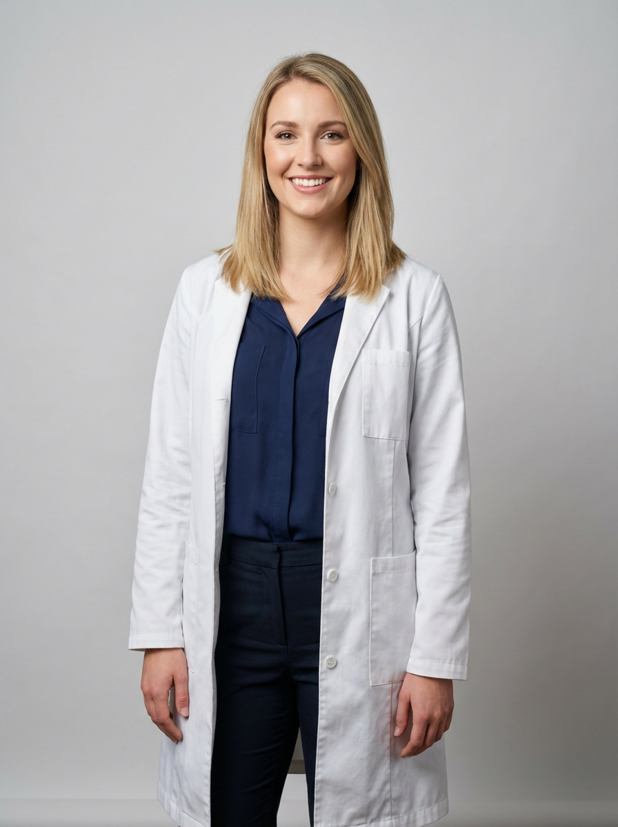 A professional doctor headshot of a confident model, taken in a well-lit studio with a plain backdrop. The model is dressed in a crisp, white lab coat over a professional blouse with natural makeup and a confident smile . The lighting is soft and even, highlighting their facial features with a warm and authoritative expression. The focus is sharp, capturing the model's eyes and reassuring smile, creating a perfect headshot for medical practices and professional profiles.