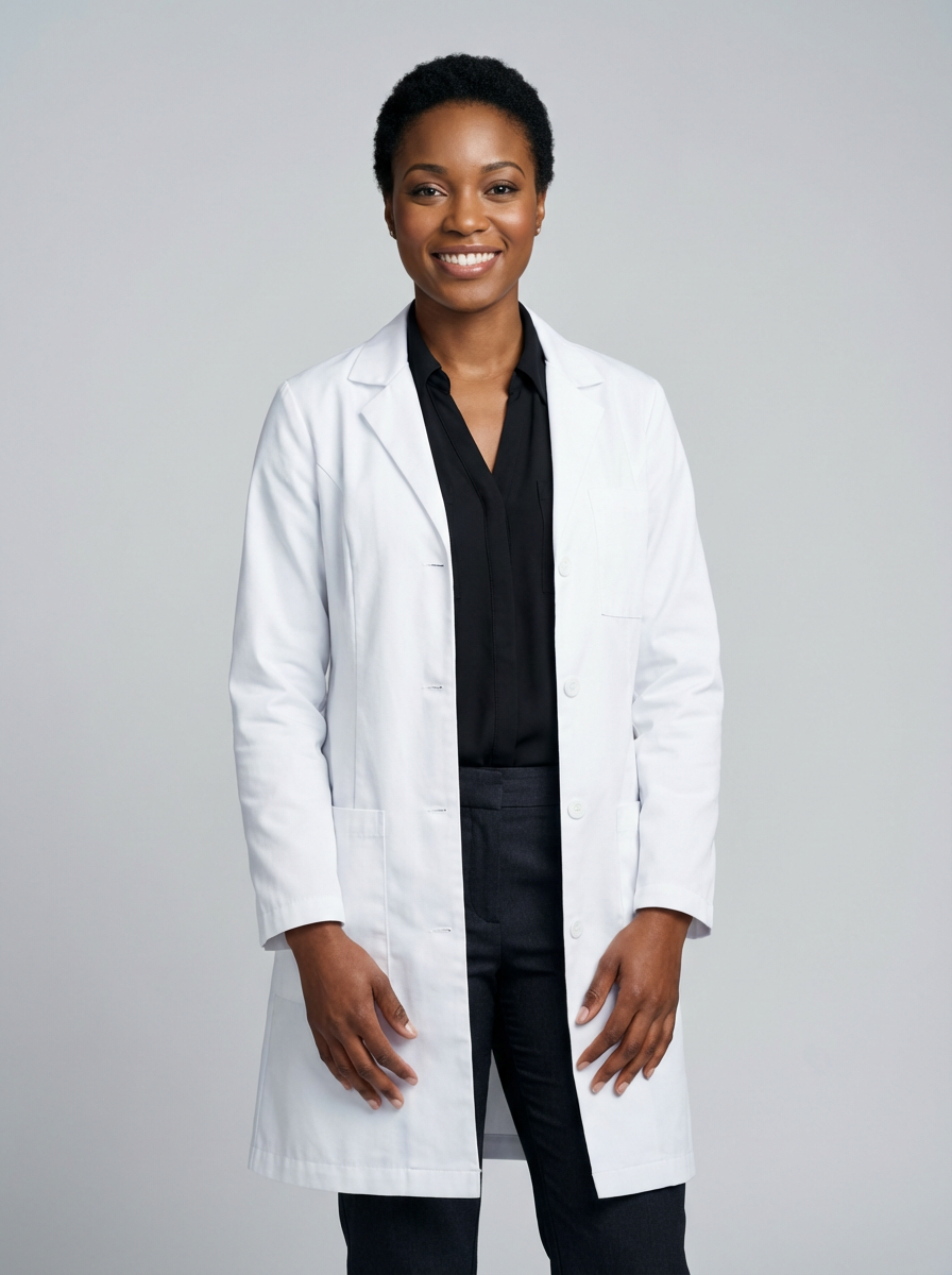A professional doctor headshot of a confident model, taken in a well-lit studio with a plain backdrop. The model is dressed in a crisp, white lab coat over a professional blouse with natural makeup and a confident smile . The lighting is soft and even, highlighting their facial features with a warm and authoritative expression. The focus is sharp, capturing the model's eyes and reassuring smile, creating a perfect headshot for medical practices and professional profiles.