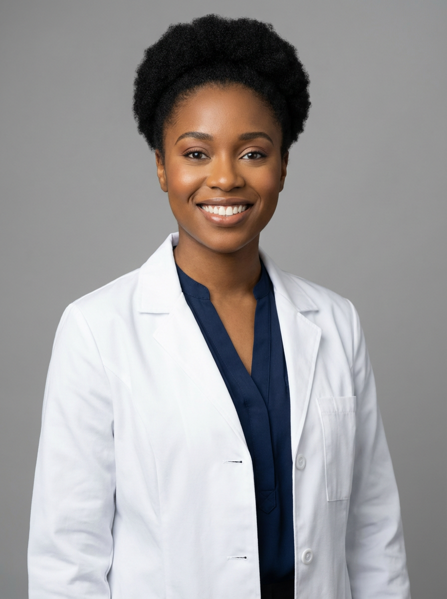 A professional doctor headshot of a confident model, taken in a well-lit studio with a plain backdrop. The model is dressed in a crisp, white lab coat over a professional blouse with natural makeup and a confident smile . The lighting is soft and even, highlighting their facial features with a warm and authoritative expression. The focus is sharp, capturing the model's eyes and reassuring smile, creating a perfect headshot for medical practices and professional profiles.