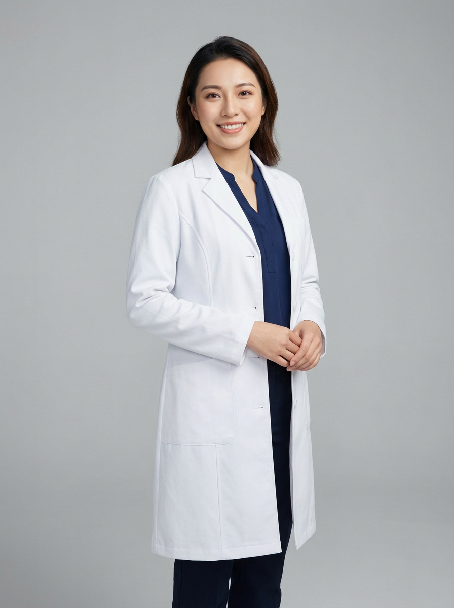 A professional doctor headshot of a confident model, taken in a well-lit studio with a plain backdrop. The model is dressed in a crisp, white lab coat over a professional blouse with natural makeup and a confident smile . The lighting is soft and even, highlighting their facial features with a warm and authoritative expression. The focus is sharp, capturing the model's eyes and reassuring smile, creating a perfect headshot for medical practices and professional profiles.