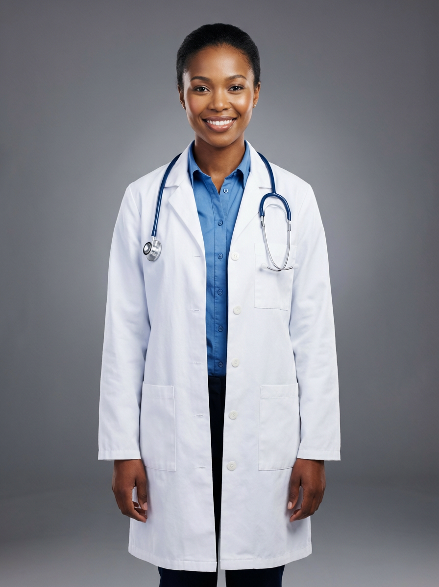 A professional doctor headshot of a confident model, taken in a well-lit studio with a plain backdrop. The model is dressed in a crisp, white lab coat over a professional blouse with natural makeup and a confident smile . The lighting is soft and even, highlighting their facial features with a warm and authoritative expression. The focus is sharp, capturing the model's eyes and reassuring smile, creating a perfect headshot for medical practices and professional profiles.
