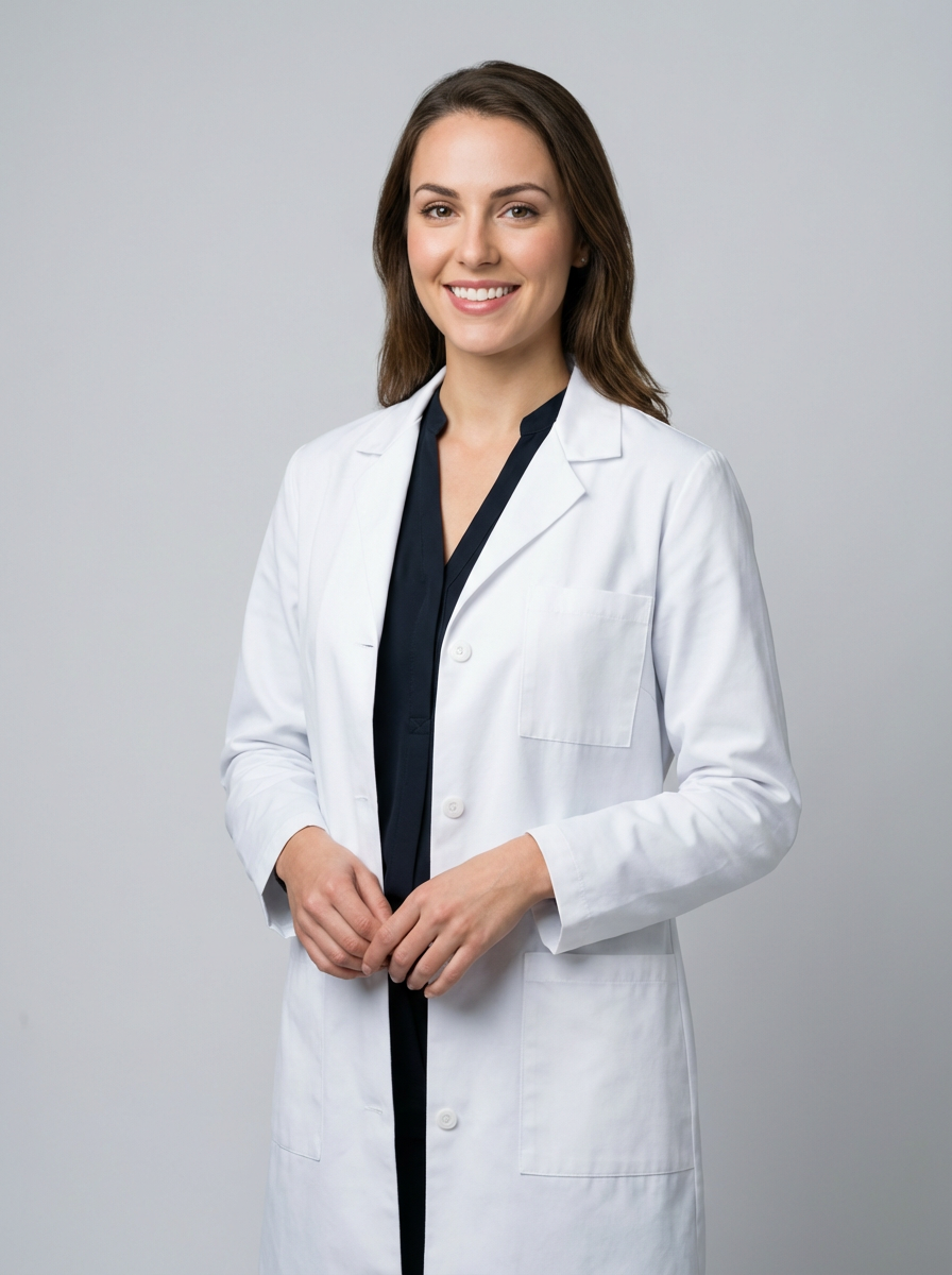 A professional doctor headshot of a confident model, taken in a well-lit studio with a plain backdrop. The model is dressed in a crisp, white lab coat over a professional blouse with natural makeup and a confident smile . The lighting is soft and even, highlighting their facial features with a warm and authoritative expression. The focus is sharp, capturing the model's eyes and reassuring smile, creating a perfect headshot for medical practices and professional profiles.