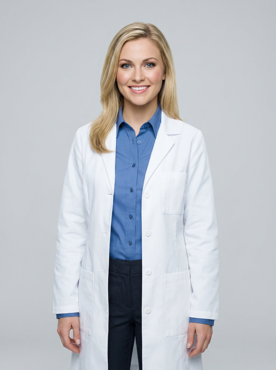 A professional doctor headshot of a confident model, taken in a well-lit studio with a plain backdrop. The model is dressed in a crisp, white lab coat over a professional blouse with natural makeup and a confident smile . The lighting is soft and even, highlighting their facial features with a warm and authoritative expression. The focus is sharp, capturing the model's eyes and reassuring smile, creating a perfect headshot for medical practices and professional profiles.