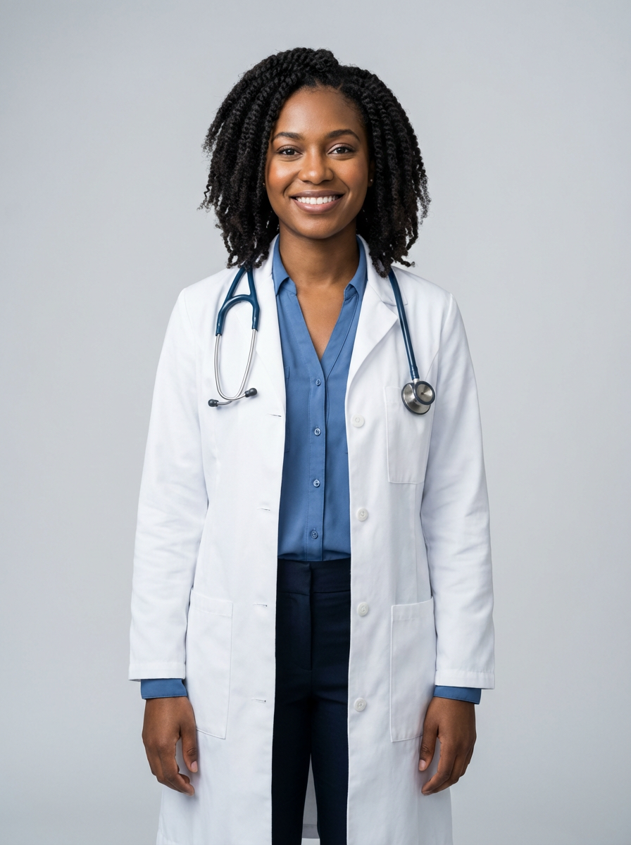 A professional doctor headshot of a confident model, taken in a well-lit studio with a plain backdrop. The model is dressed in a crisp, white lab coat over a professional blouse with natural makeup and a confident smile . The lighting is soft and even, highlighting their facial features with a warm and authoritative expression. The focus is sharp, capturing the model's eyes and reassuring smile, creating a perfect headshot for medical practices and professional profiles.