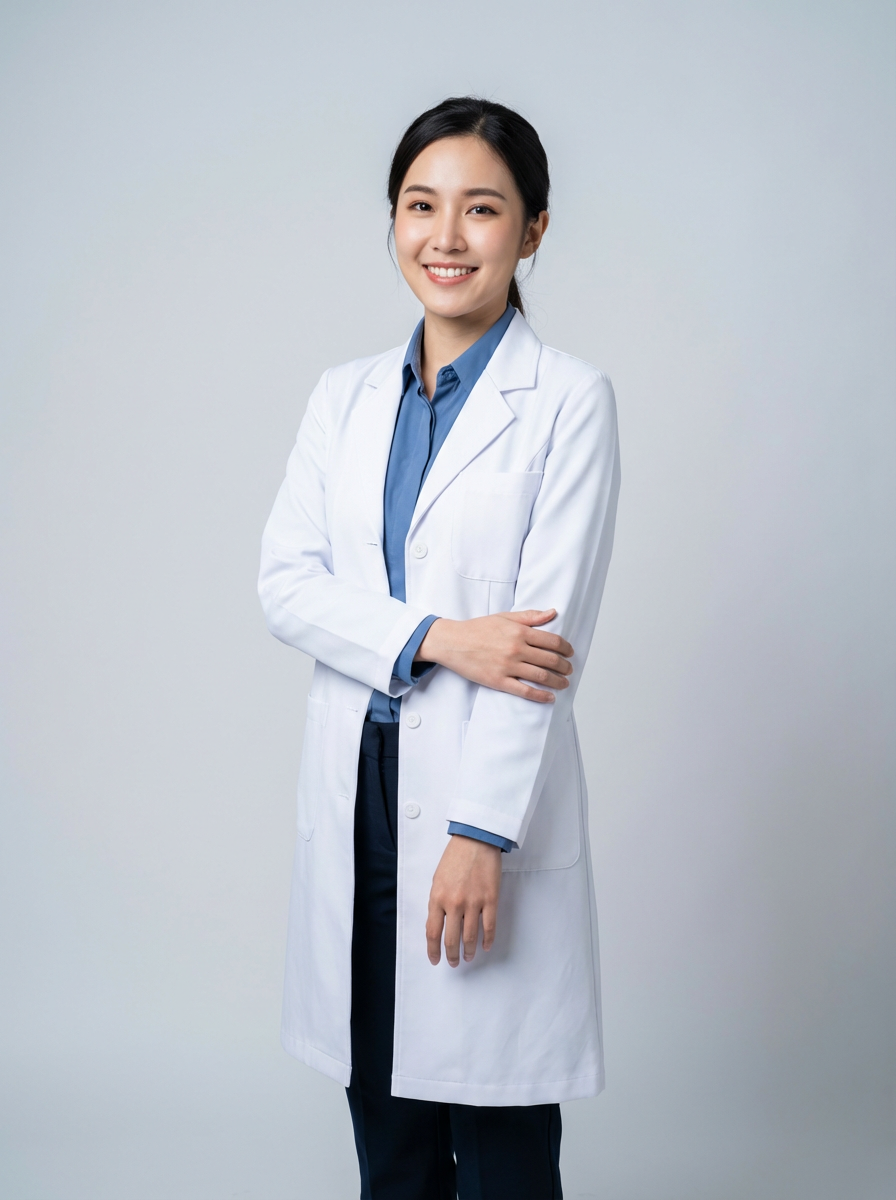 A professional doctor headshot of a confident model, taken in a well-lit studio with a plain backdrop. The model is dressed in a crisp, white lab coat over a professional blouse with natural makeup and a confident smile . The lighting is soft and even, highlighting their facial features with a warm and authoritative expression. The focus is sharp, capturing the model's eyes and reassuring smile, creating a perfect headshot for medical practices and professional profiles.