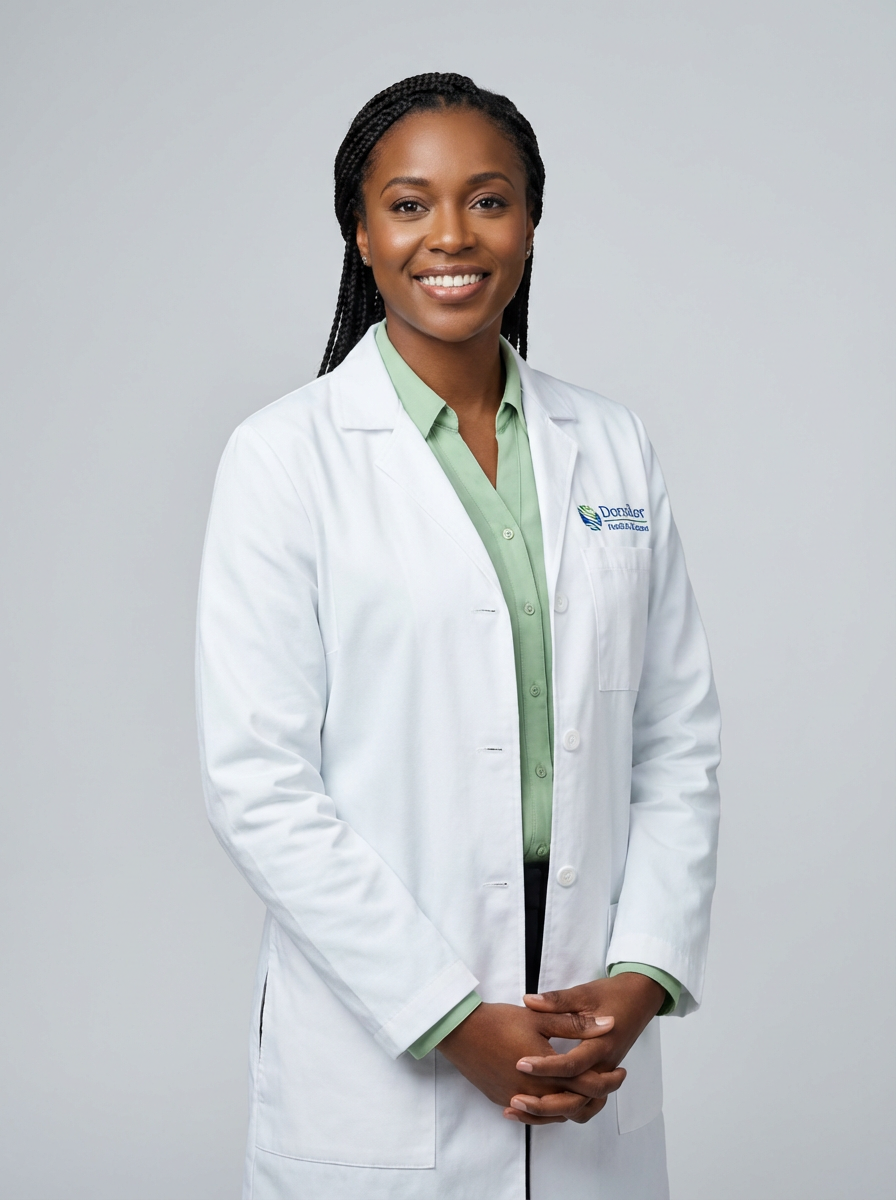 A professional doctor headshot of a confident model, taken in a well-lit studio with a plain backdrop. The model is dressed in a crisp, white lab coat over a professional blouse with natural makeup and a confident smile . The lighting is soft and even, highlighting their facial features with a warm and authoritative expression. The focus is sharp, capturing the model's eyes and reassuring smile, creating a perfect headshot for medical practices and professional profiles.
