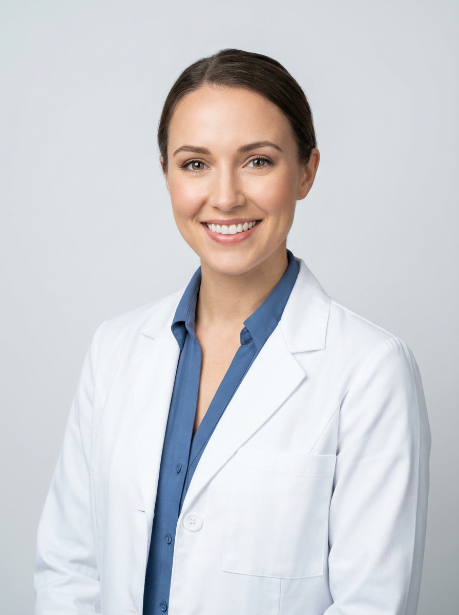 A professional doctor headshot of a confident model, taken in a well-lit studio with a plain backdrop. The model is dressed in a crisp, white lab coat over a professional blouse with natural makeup and a confident smile . The lighting is soft and even, highlighting their facial features with a warm and authoritative expression. The focus is sharp, capturing the model's eyes and reassuring smile, creating a perfect headshot for medical practices and professional profiles.