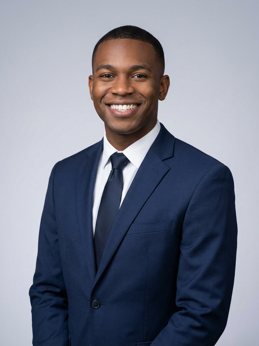 A professional lawyer headshot of a confident model, taken in a well-lit studio with a plain backdrop. The model is dressed in a sharp suit with a neat tie and a confident expression. The lighting is soft and even, highlighting their facial features with a professional and authoritative expression. The focus is sharp, capturing the model's eyes and engaging smile, creating a perfect headshot for law firm profiles and professional branding.