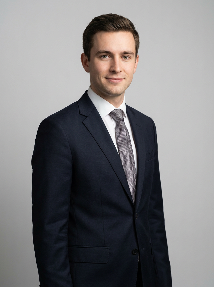 A professional lawyer headshot of a confident model, taken in a well-lit studio with a plain backdrop. The model is dressed in a sharp suit with a neat tie and a confident expression. The lighting is soft and even, highlighting their facial features with a professional and authoritative expression. The focus is sharp, capturing the model's eyes and engaging smile, creating a perfect headshot for law firm profiles and professional branding.