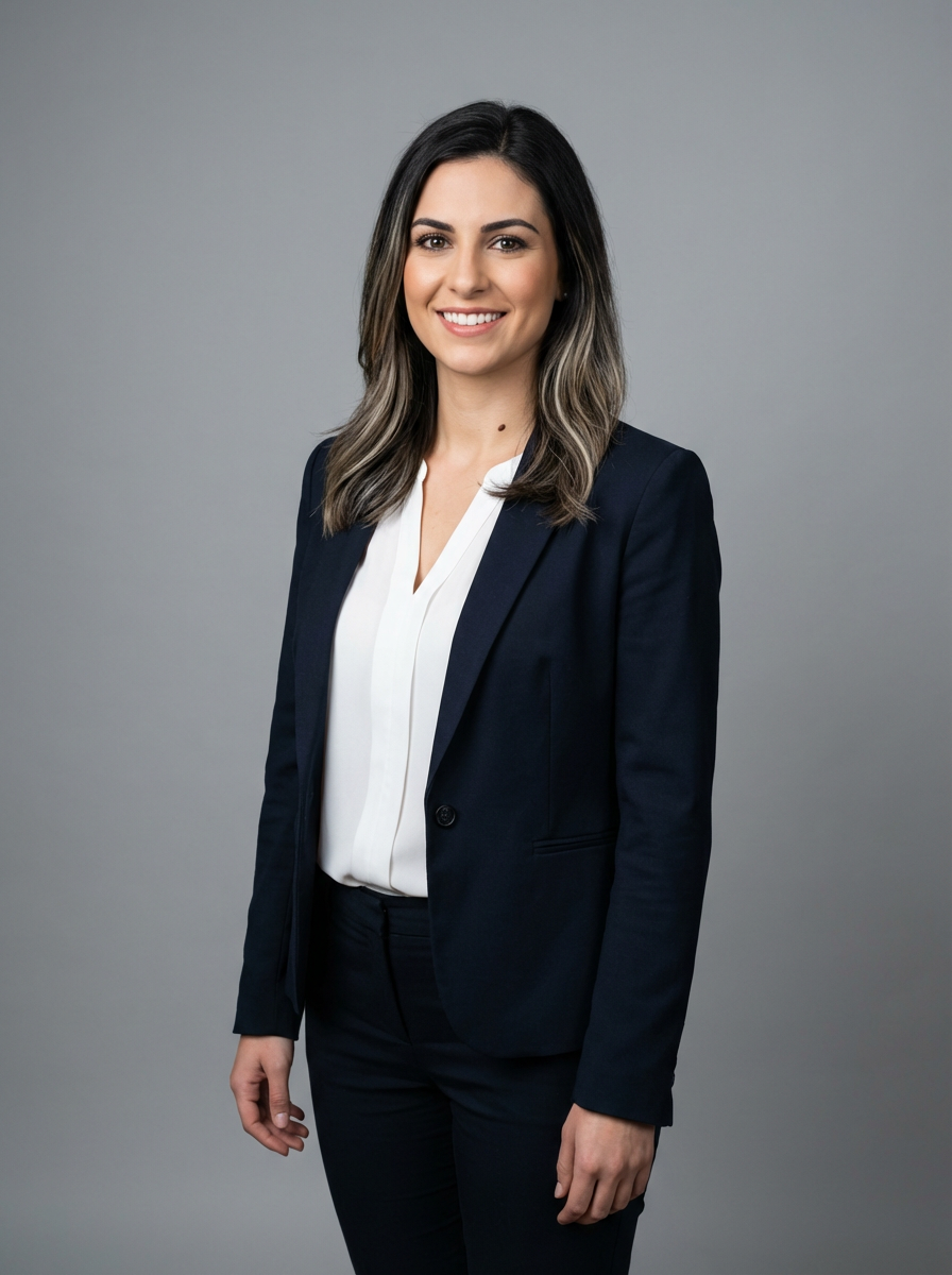 A professional lawyer headshot of a confident model, taken in a well-lit studio with a plain backdrop. The model is dressed in a tailored blazer with a crisp blouse and a confident smile . The lighting is soft and even, highlighting their facial features with a professional and authoritative expression. The focus is sharp, capturing the model's eyes and engaging smile, creating a perfect headshot for law firm profiles and professional branding.