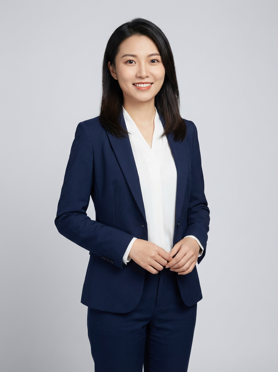 A professional lawyer headshot of a confident model, taken in a well-lit studio with a plain backdrop. The model is dressed in a tailored blazer with a crisp blouse and a confident smile . The lighting is soft and even, highlighting their facial features with a professional and authoritative expression. The focus is sharp, capturing the model's eyes and engaging smile, creating a perfect headshot for law firm profiles and professional branding.