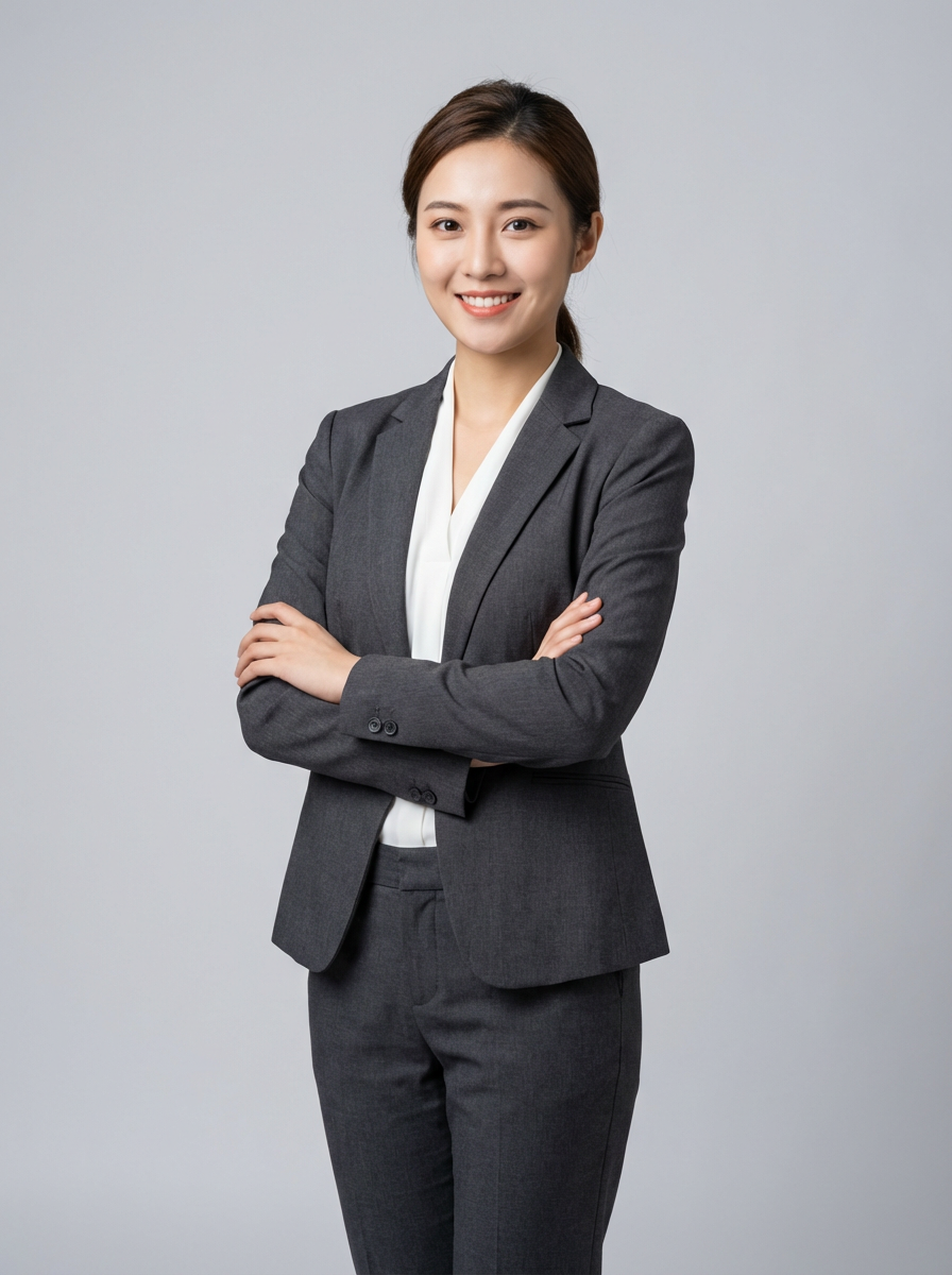 A professional lawyer headshot of a confident model, taken in a well-lit studio with a plain backdrop. The model is dressed in a tailored blazer with a crisp blouse and a confident smile . The lighting is soft and even, highlighting their facial features with a professional and authoritative expression. The focus is sharp, capturing the model's eyes and engaging smile, creating a perfect headshot for law firm profiles and professional branding.