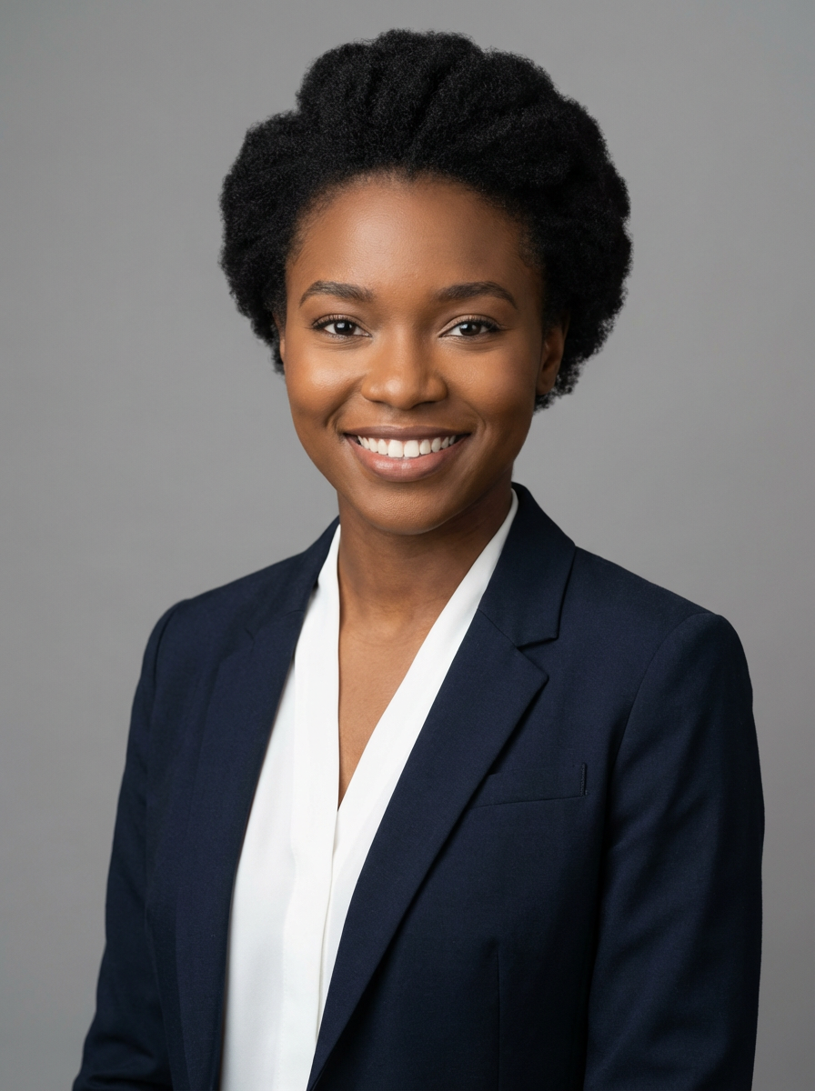 A professional lawyer headshot of a confident model, taken in a well-lit studio with a plain backdrop. The model is dressed in a tailored blazer with a crisp blouse and a confident smile . The lighting is soft and even, highlighting their facial features with a professional and authoritative expression. The focus is sharp, capturing the model's eyes and engaging smile, creating a perfect headshot for law firm profiles and professional branding.