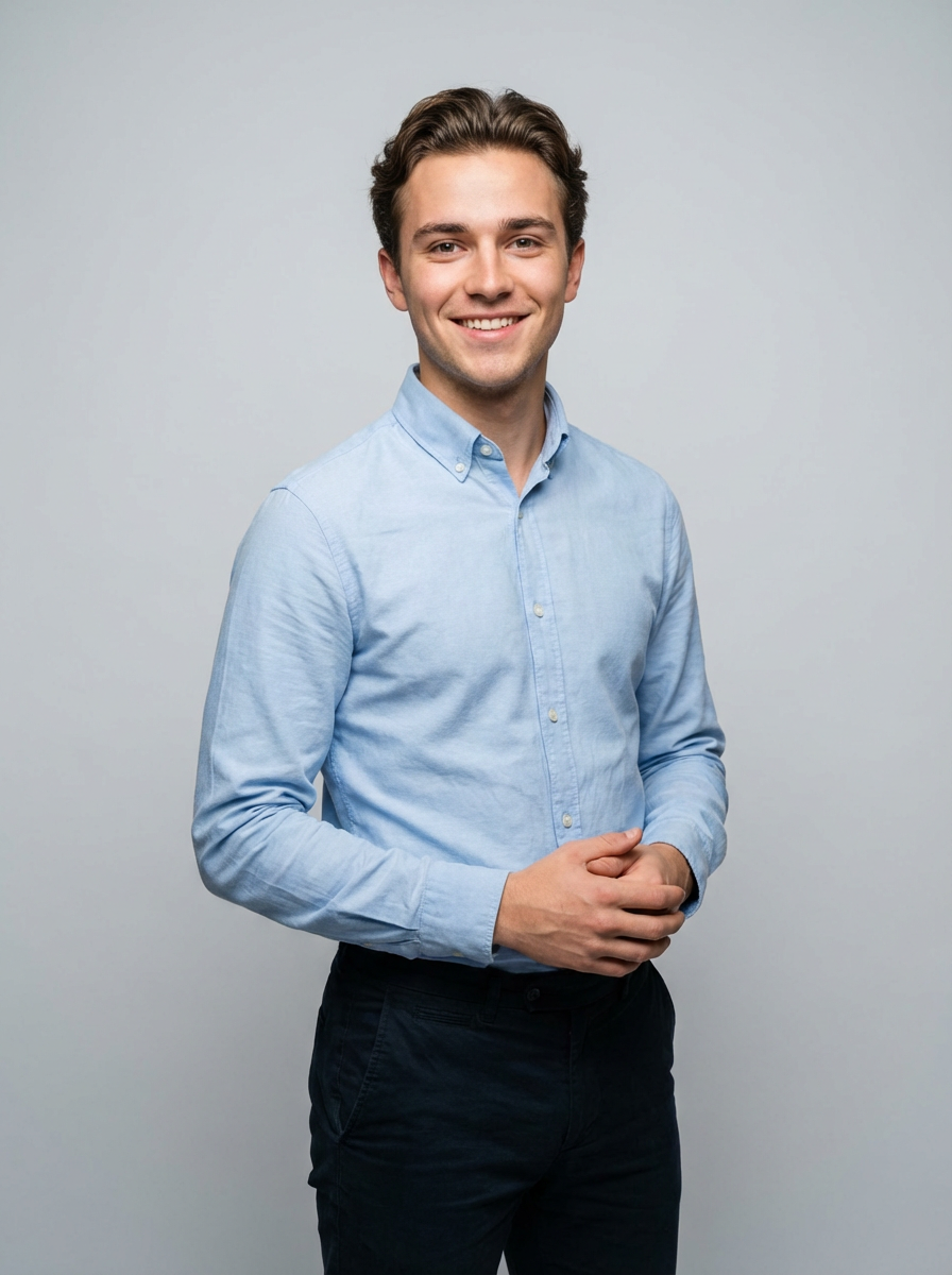 A professional life coach headshot of an inspiring model, taken in a well-lit studio with a plain backdrop. The model is dressed in a neat, light-colored shirt with a motivational expression. The lighting is soft and even, highlighting their facial features with a warm and encouraging expression. The focus is sharp, capturing the model's eyes and uplifting smile, creating a perfect headshot for coaching practices and professional profiles.