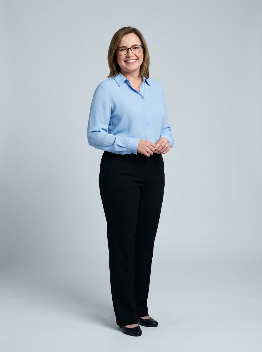A professional life coach headshot of an inspiring model, taken in a well-lit studio with a plain backdrop. The model is dressed in a soft, professional blouse with natural makeup and a confident smile . The lighting is soft and even, highlighting their facial features with a warm and encouraging expression. The focus is sharp, capturing the model's eyes and uplifting smile, creating a perfect headshot for coaching practices and professional profiles.