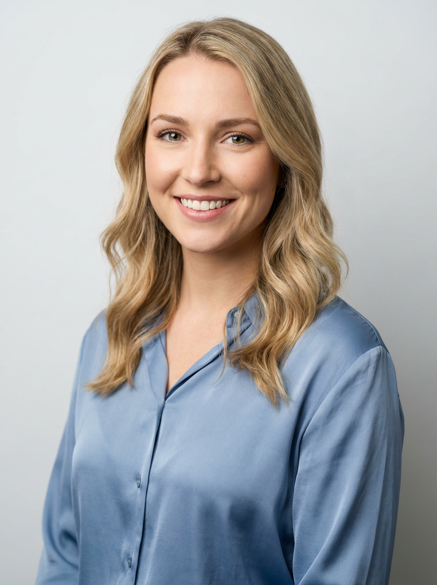 A professional life coach headshot of an inspiring model, taken in a well-lit studio with a plain backdrop. The model is dressed in a soft, professional blouse with natural makeup and a confident smile . The lighting is soft and even, highlighting their facial features with a warm and encouraging expression. The focus is sharp, capturing the model's eyes and uplifting smile, creating a perfect headshot for coaching practices and professional profiles.