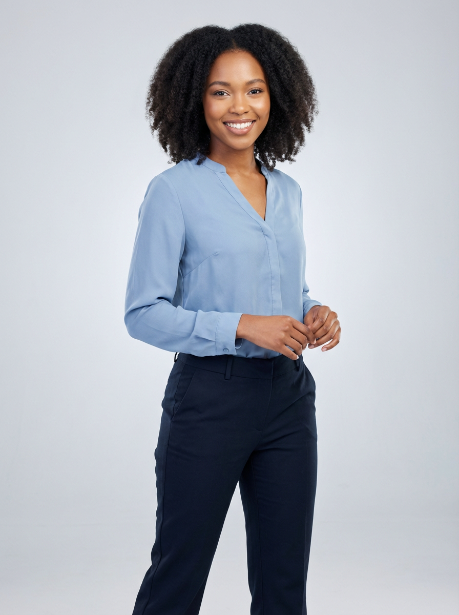 A professional life coach headshot of an inspiring model, taken in a well-lit studio with a plain backdrop. The model is dressed in a soft, professional blouse with natural makeup and a confident smile . The lighting is soft and even, highlighting their facial features with a warm and encouraging expression. The focus is sharp, capturing the model's eyes and uplifting smile, creating a perfect headshot for coaching practices and professional profiles.