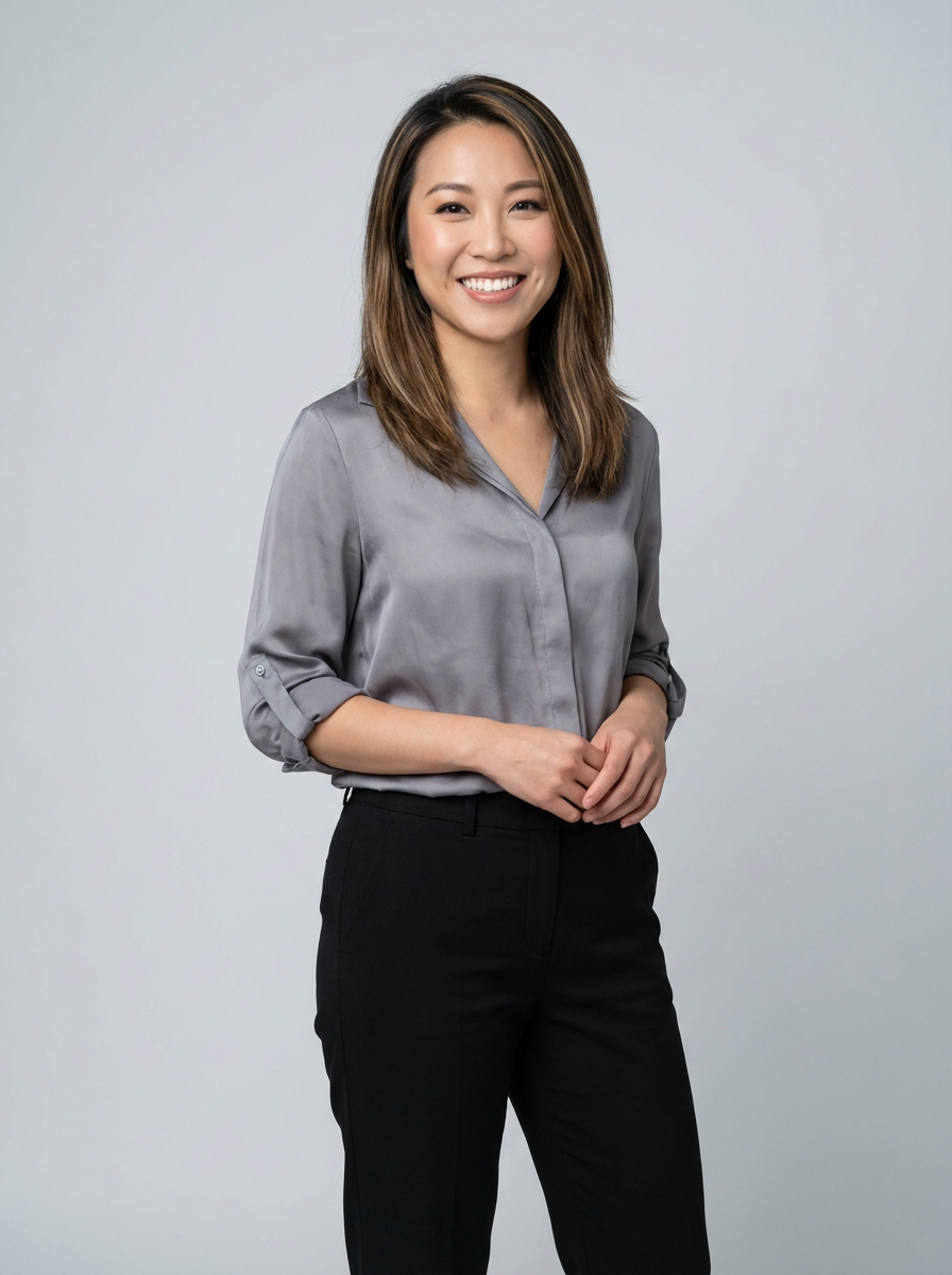 A professional life coach headshot of an inspiring model, taken in a well-lit studio with a plain backdrop. The model is dressed in a soft, professional blouse with natural makeup and a confident smile . The lighting is soft and even, highlighting their facial features with a warm and encouraging expression. The focus is sharp, capturing the model's eyes and uplifting smile, creating a perfect headshot for coaching practices and professional profiles.