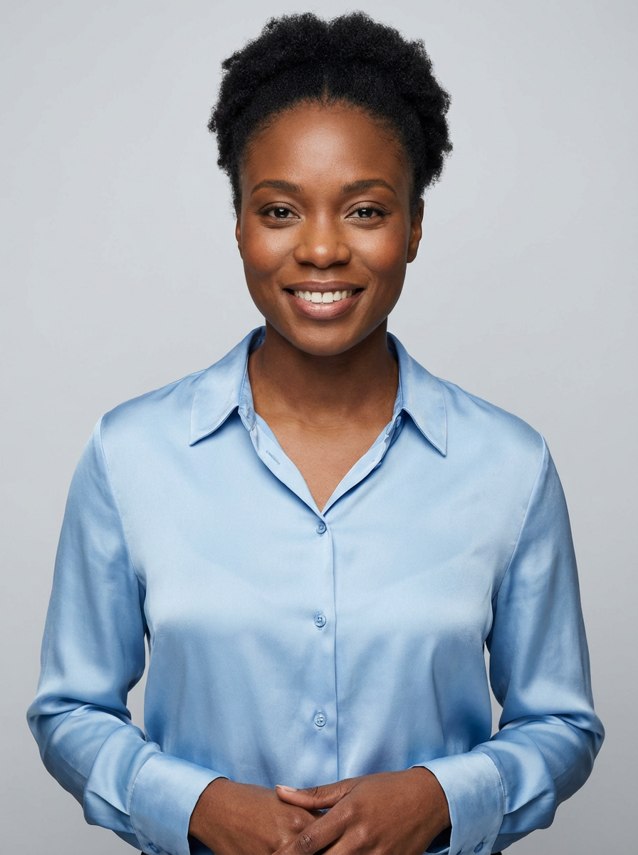A professional life coach headshot of an inspiring model, taken in a well-lit studio with a plain backdrop. The model is dressed in a soft, professional blouse with natural makeup and a confident smile . The lighting is soft and even, highlighting their facial features with a warm and encouraging expression. The focus is sharp, capturing the model's eyes and uplifting smile, creating a perfect headshot for coaching practices and professional profiles.