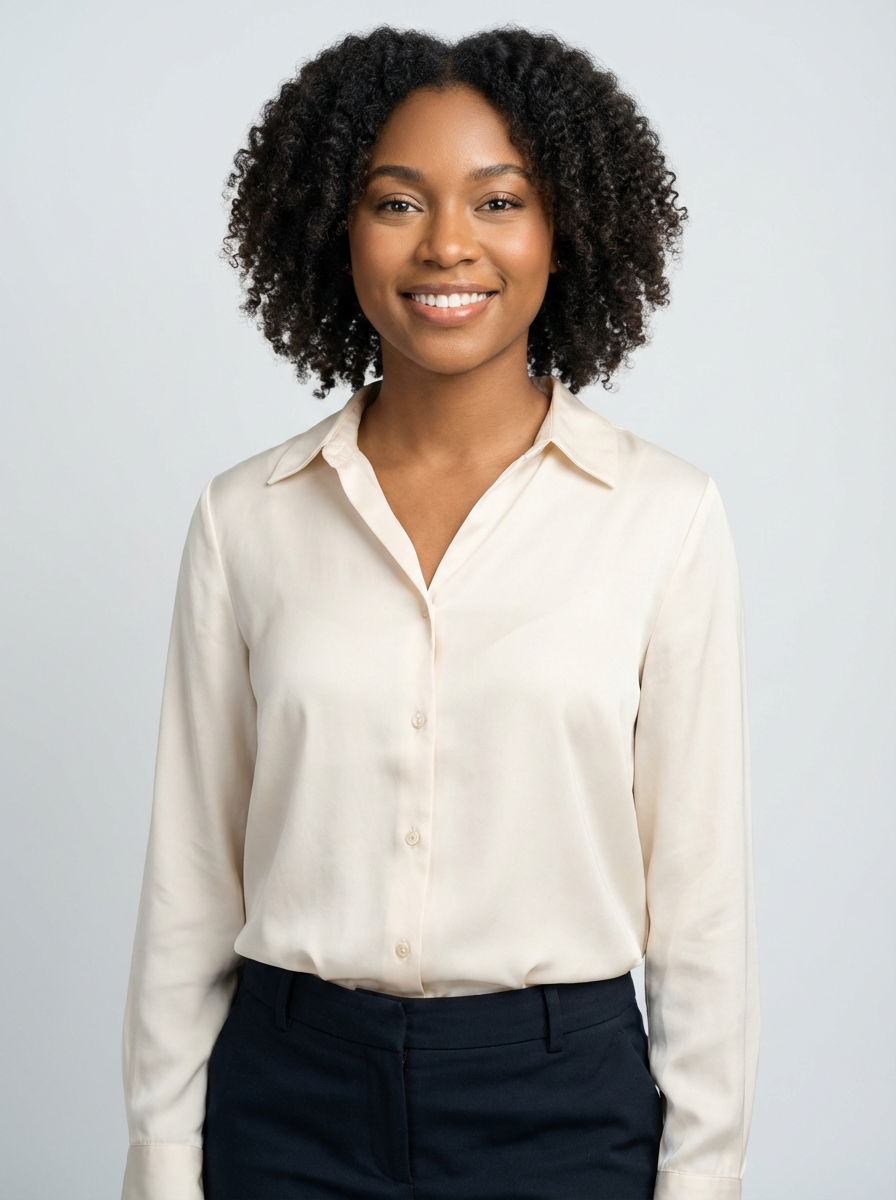 A professional life coach headshot of an inspiring model, taken in a well-lit studio with a plain backdrop. The model is dressed in a soft, professional blouse with natural makeup and a confident smile . The lighting is soft and even, highlighting their facial features with a warm and encouraging expression. The focus is sharp, capturing the model's eyes and uplifting smile, creating a perfect headshot for coaching practices and professional profiles.