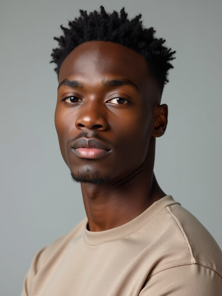 A professional photography model headshot of a confident model, taken in a well-lit studio with a clean, neutral backdrop. The model is dressed in a fitted, neutral-colored crewneck shirt with neatly styled hair, ensuring a polished yet natural look. The lighting is soft and even, accentuating the model’s bone structure, skin texture, and striking features. The focus is sharp, with a clear emphasis on the model\'s eyes and subtle expression, creating the perfect headshot for agency submissions, portfolio updates, and professional branding in fashion and commercial maning.