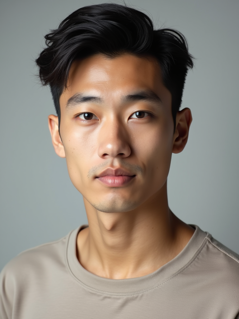 A professional photography model headshot of a confident model, taken in a well-lit studio with a clean, neutral backdrop. The model is dressed in a fitted, neutral-colored crewneck shirt with neatly styled hair, ensuring a polished yet natural look. The lighting is soft and even, accentuating the model’s bone structure, skin texture, and striking features. The focus is sharp, with a clear emphasis on the model\'s eyes and subtle expression, creating the perfect headshot for agency submissions, portfolio updates, and professional branding in fashion and commercial maning.