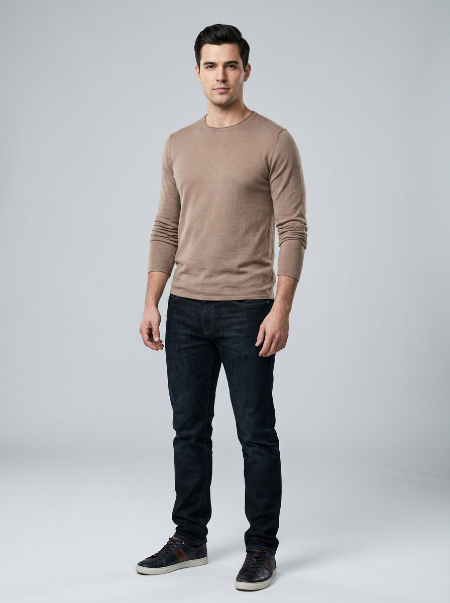 A professional photography model headshot of a confident model, taken in a well-lit studio with a clean, neutral backdrop. The model is dressed in a fitted, neutral-colored crewneck shirt with neatly styled hair, ensuring a polished yet natural look. The lighting is soft and even, accentuating the model\'s bone structure, skin texture, and striking features. The focus is sharp, with a clear emphasis on the model\'s eyes and subtle expression, creating the perfect headshot for agency submissions, portfolio updates, and professional branding in fashion and commercial maning.